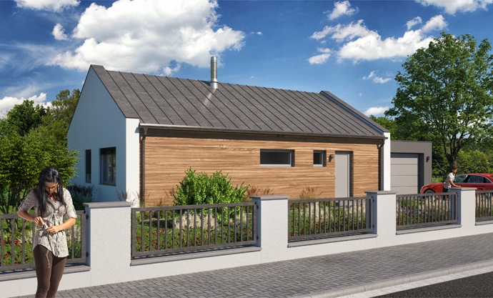 Jednopodlažní dům o dispozici 3 + kk + g je vhodným řešením pro rodiny uvažující o jednom dítěti či jako řešení bydlení na stáří. Dům má půdorys tvaru L, kdy je dispozičně dělen na společenskou a klidovou zónu.