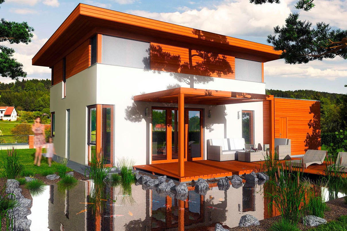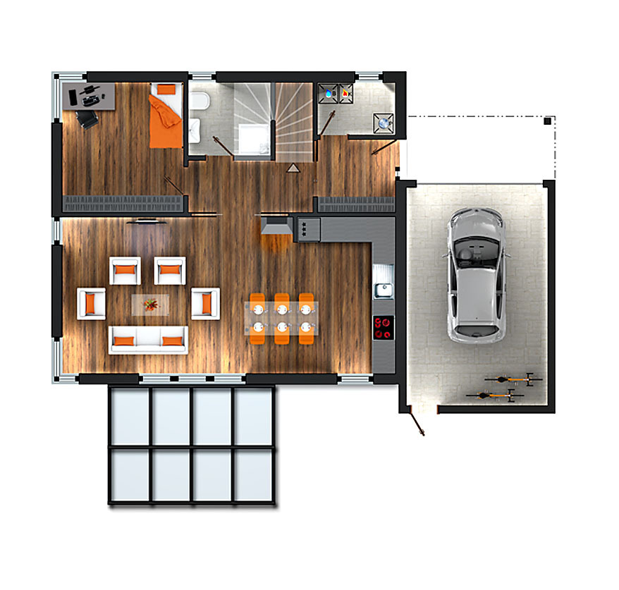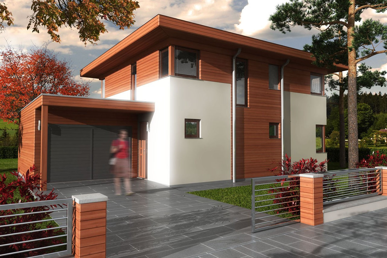 Moderní kompaktní architektura s pultovou střechou bude výrazná v městské i venkovské zástavbě, kde dům vynikne svou výškou. Postačí mu malý pozemek. Na velmi malé zastavěné ploše nabízí praktické a úsporné bydlení pro čtyřčlennou rodinu, pokoje v patře nejsou zmenšeny šikmými stropy jako v běžné podkroví. Ke schodišti je třeba projít přes celý obývací pokoj.