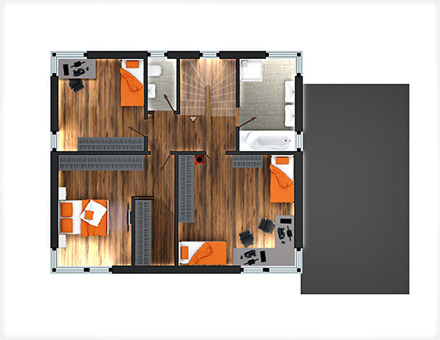 Dům nabídne pohodlné bydlení až pětičlenné rodině. Oblíbený bude jistě společný obývací prostor ve tvaru L s velkou kuchyní. V podkoroví se nacházejí prostorné dětské pokoje, nadstandardně velká ložnice rodičů a studio, vhodné jako další ložnice nebo pro práci z domova. Výhodou je také integrovaná garáž.