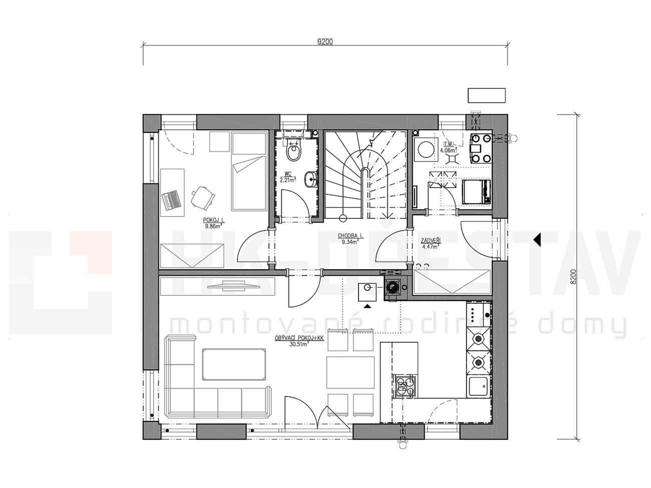 Tristar je prostorný dům s dobře vyřešenou dispozicí. V přízemí se nachází velký obytný prostor s kuchyní a jídelnou, koupelna s WC a sprchou a pokoj po hosty, který může sloužit i jako ložnice pro rodiče. Nechybí zde pracovna, která může být i technickou místností. V patře jsou tři ložnice, velká koupelna a praktická šatna.