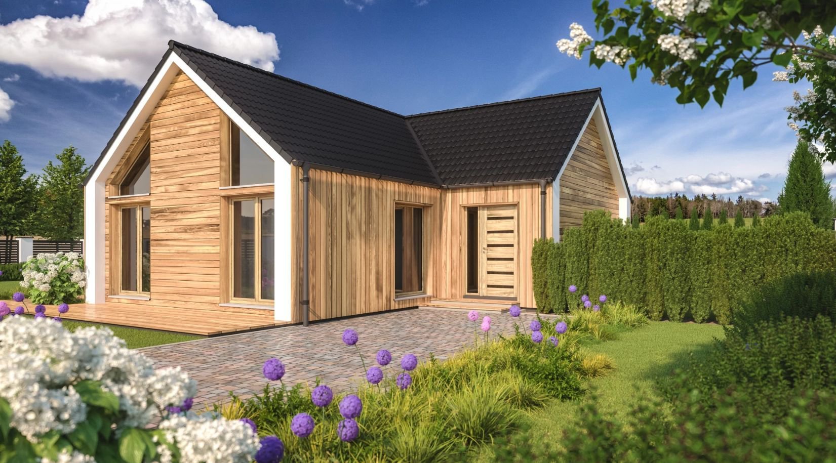 Jednoduchý bezbariérový dům poskytne praktické bydlení za výhodnou cenu a s nízkými provozními náklady. Hodí se do městské i venkovské zástavby, má příjemnou krytou terasu a francouzská okno z pokojů přímo na zahradu. Určitou daní za úspornost je malá koupelna bez vany, navíc spojená s tech. místností.