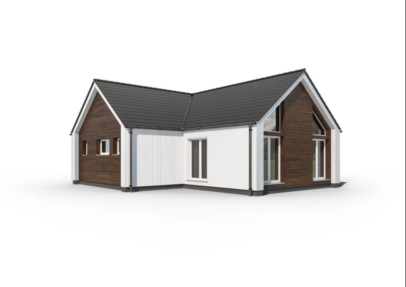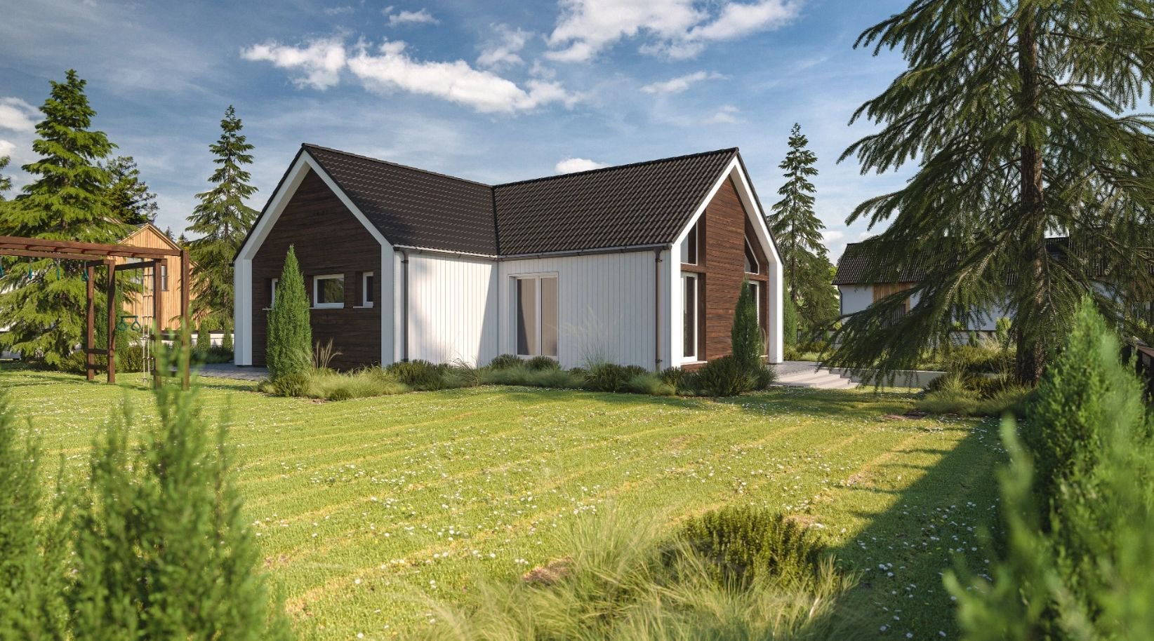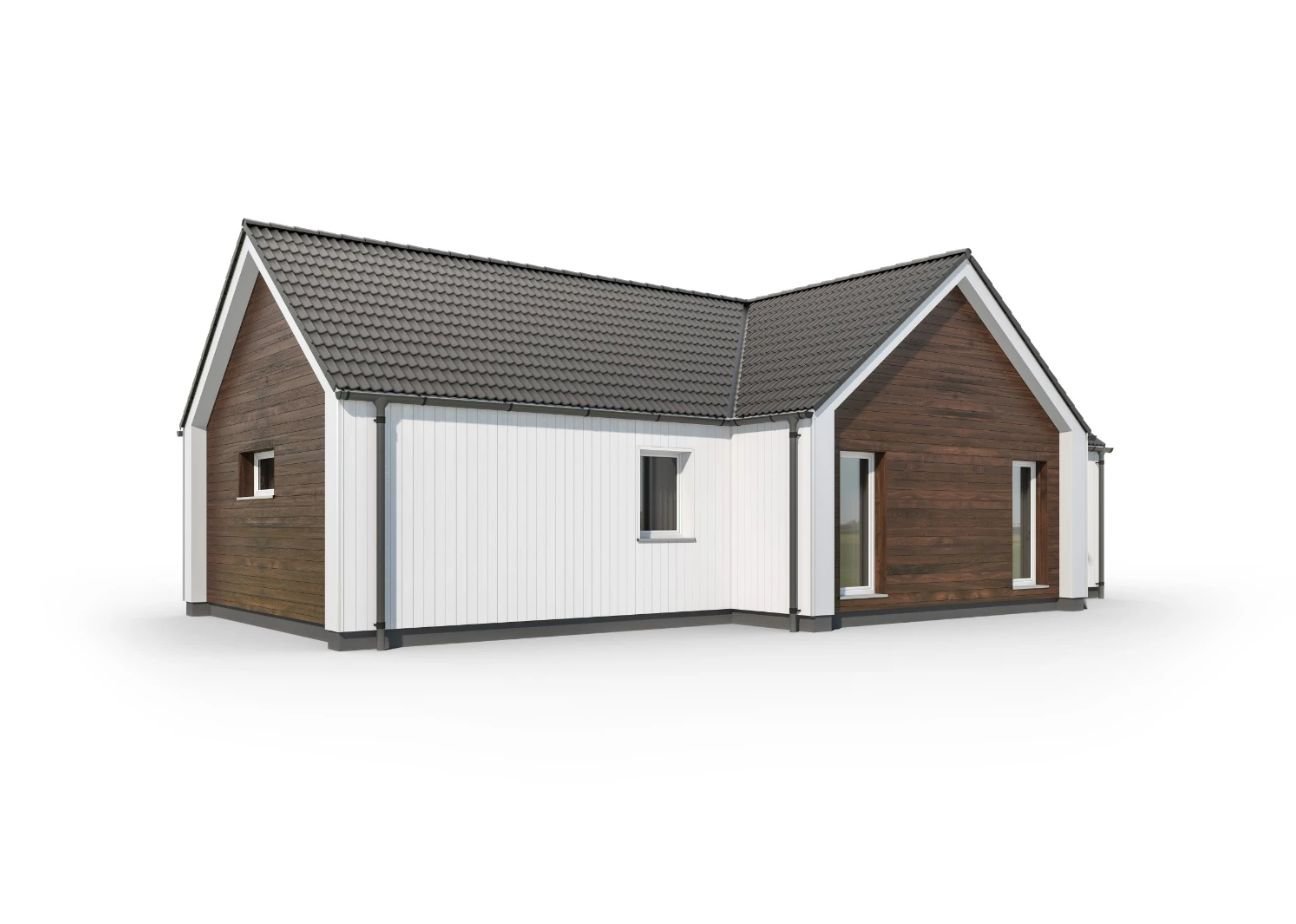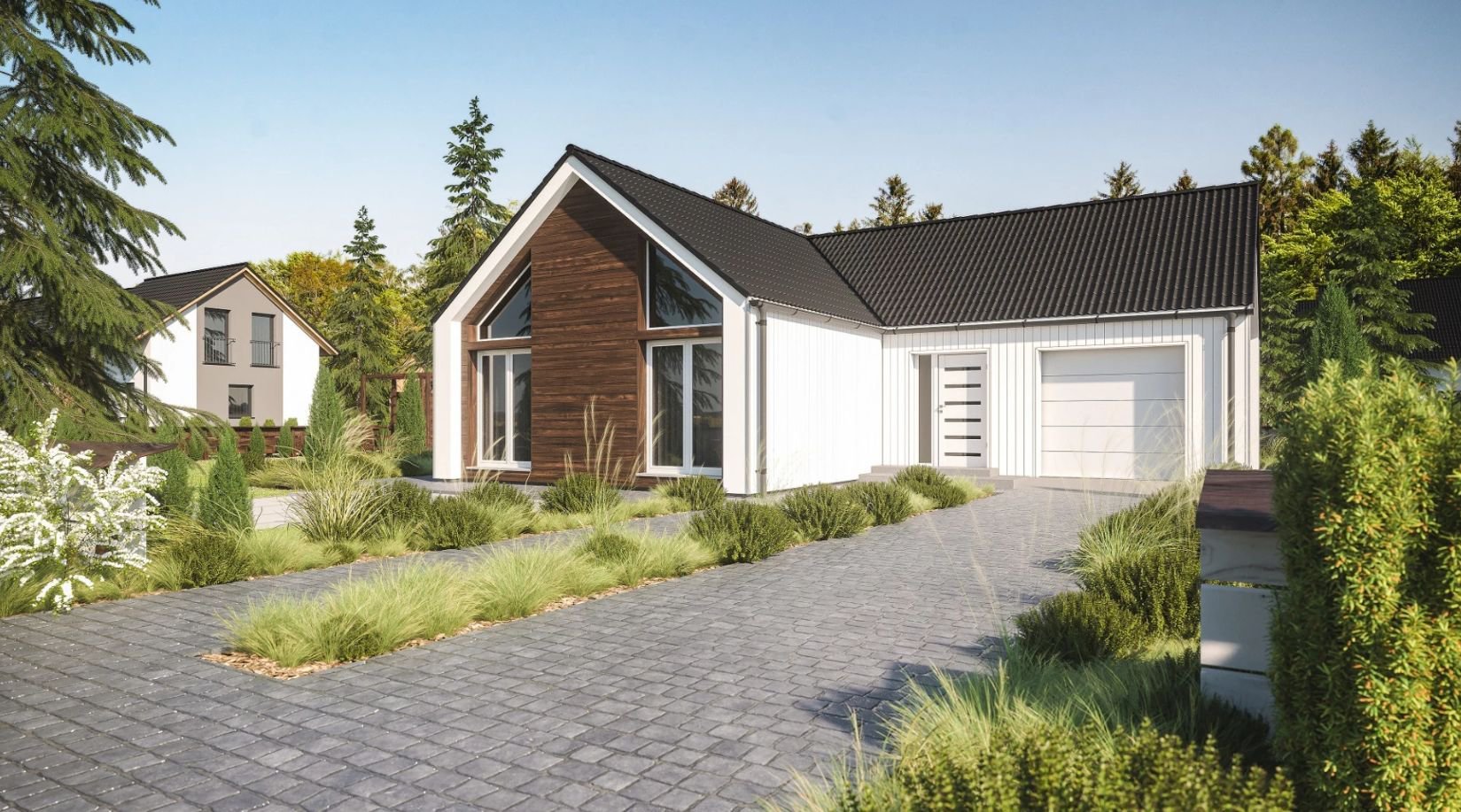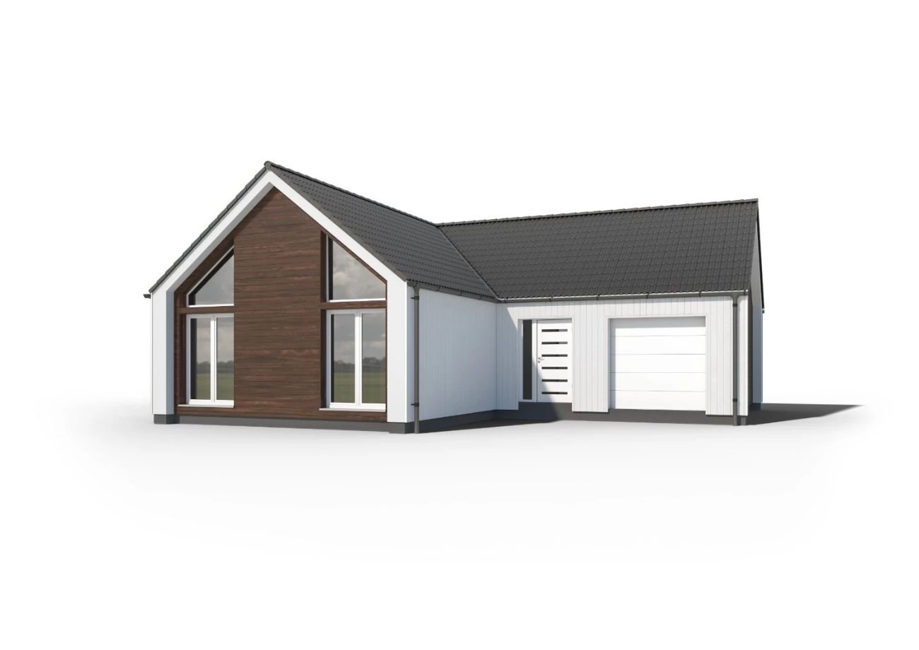 Půvabná dřevostavba zajímavým způsobem ztvárňuje tradiční archetyp domu se sedlovou střechu. Poskytne praktické bezbariérové bydlení čt... yřčlenné rodině s odpovídajícím zázemím, Určitě si oblíbí atraktivní společný obývací prostor s okny do 3 stran a vysokým stopem. Benefit nabízí i garáž propojená s domem.