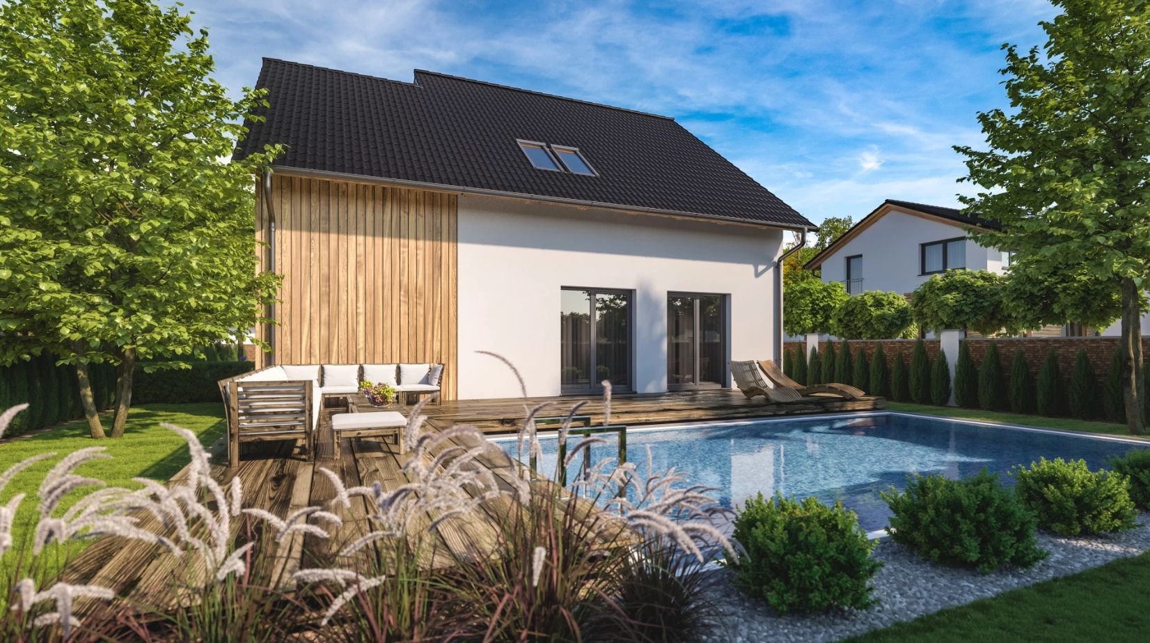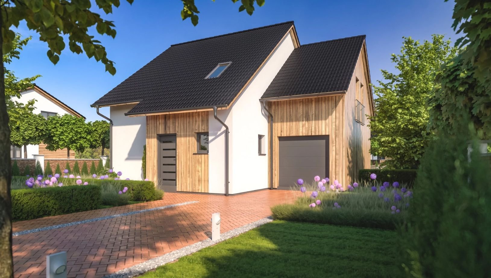 Dům spojuje promyšlenou dispozici a moderní komfort s ekologickými aspekty. Je součástí harmonického obytného celku s upravenou zelení a komunitním prostorem. Díky vyššímu hřebeni střechy mají pokoje v podkroví nadstandardní využitelný prostor.