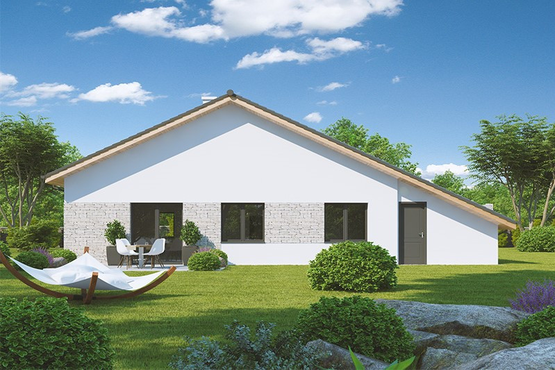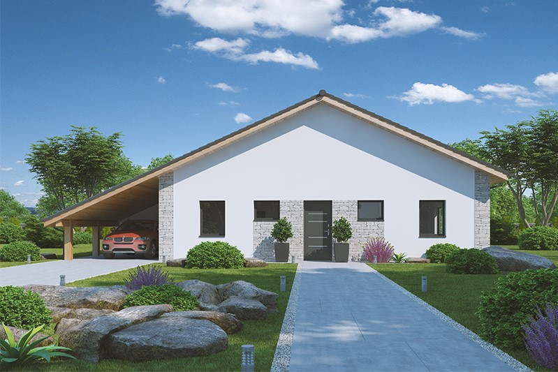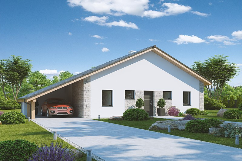 Jednopodlažní dům o dispozici 3 + kk + g je vhodným řešením pro rodiny uvažující o jednom dítěti či jako řešení bydlení na stáří. Dům má půdorys tvaru L, kdy je dispozičně dělen na společenskou a klidovou zónu.