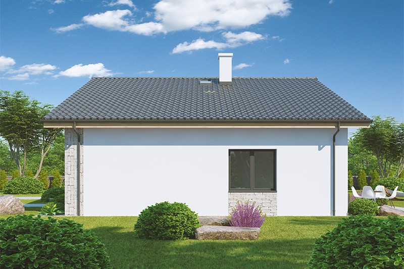 Přízemní bungalov se sedlovou střechou nabízí jednoduchou architekturu a úsporné bezbariérové bydlení pro tříčlennou rodinu. Všechny oby... tné místnosti mají soukromí – okna vedou do rekreační části zahrady. I při malé zastavěné ploše nechybí šatna, technická místnost a samostatné WC. Součástí projektu je i kryté garážové stání pro 1 automobil.