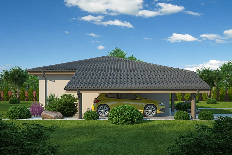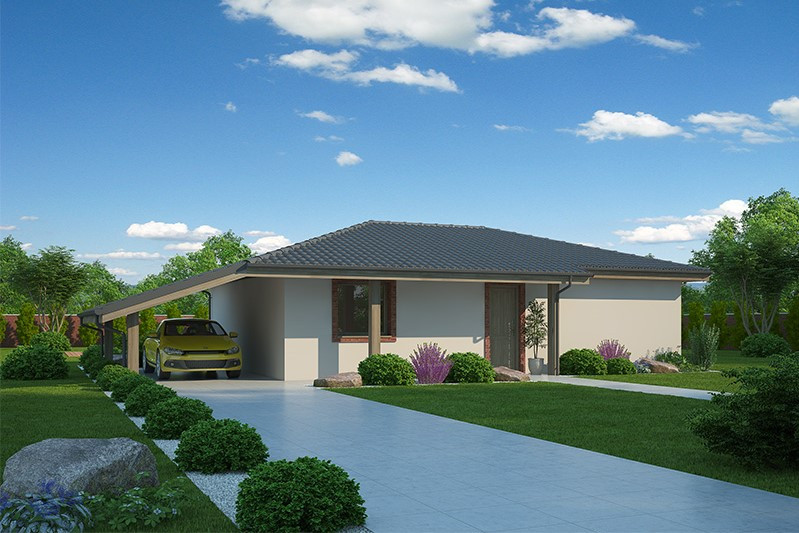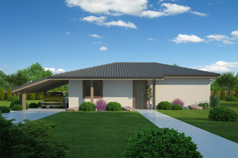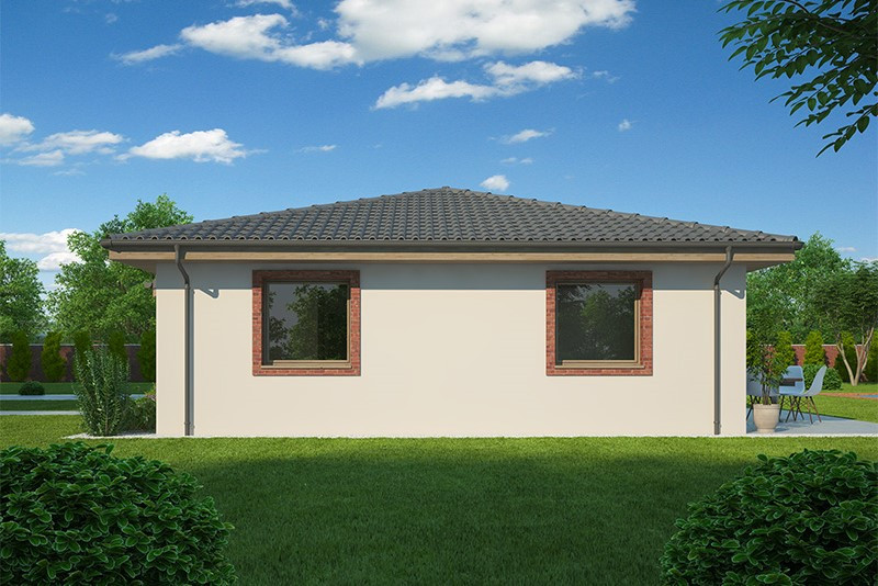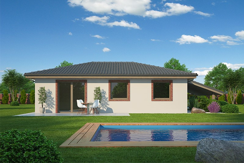 Přízemní bungalov s nízkou valbovou střechou nabízí na malé zastavěné ploše jednoduchou architekturu a úsporné bezbariérové bydlení pro... tří až čtyřčlennou rodinu. Součástí projektu je i kryté garážové stání pro 1 automobil.
