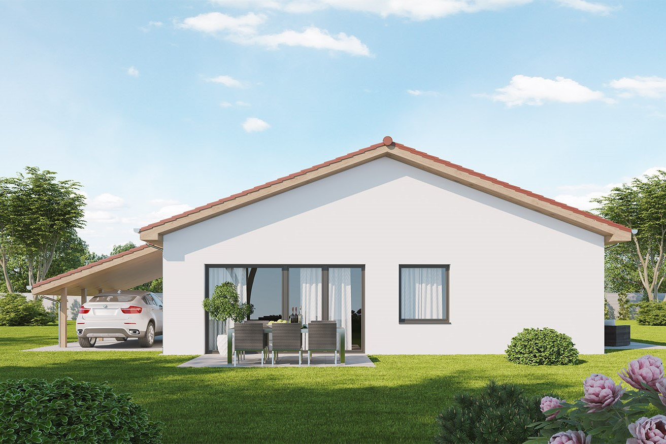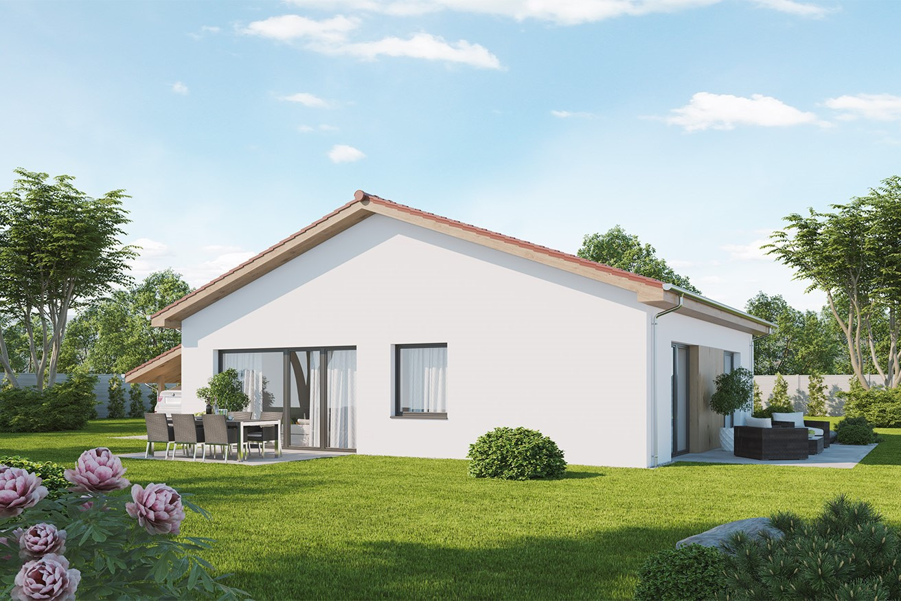 Bungalov s dispozicí ve tvaru písmene L se řadí mezi nejoblíbenější typy rodinných domů u nás. Oddělená denní a noční zóna s vlastním zázemím zajišťují pohodlný provoz domácnosti. K výhodám patří i rohová terasa a integrovaná garáž propojená se zádveřím.