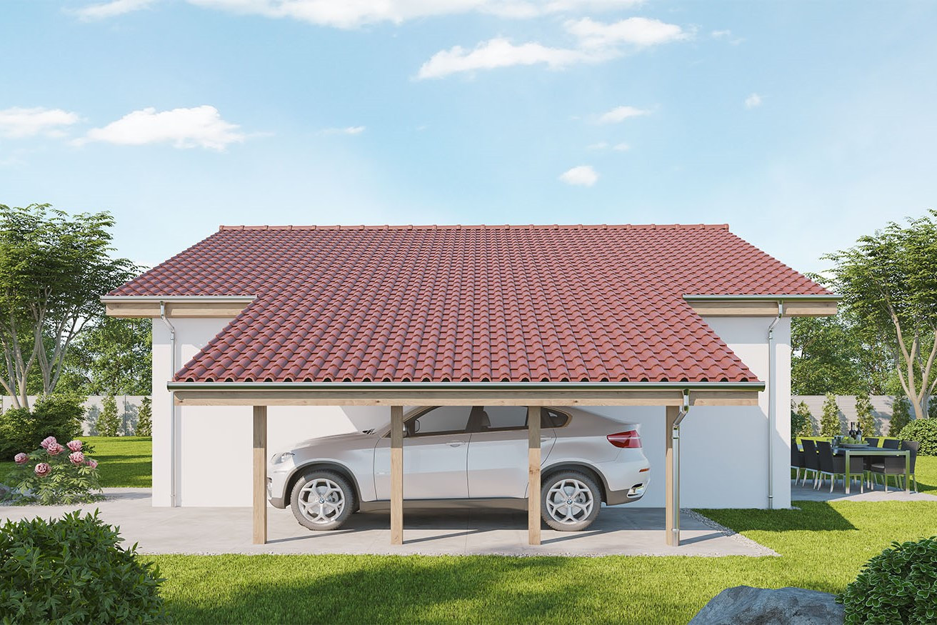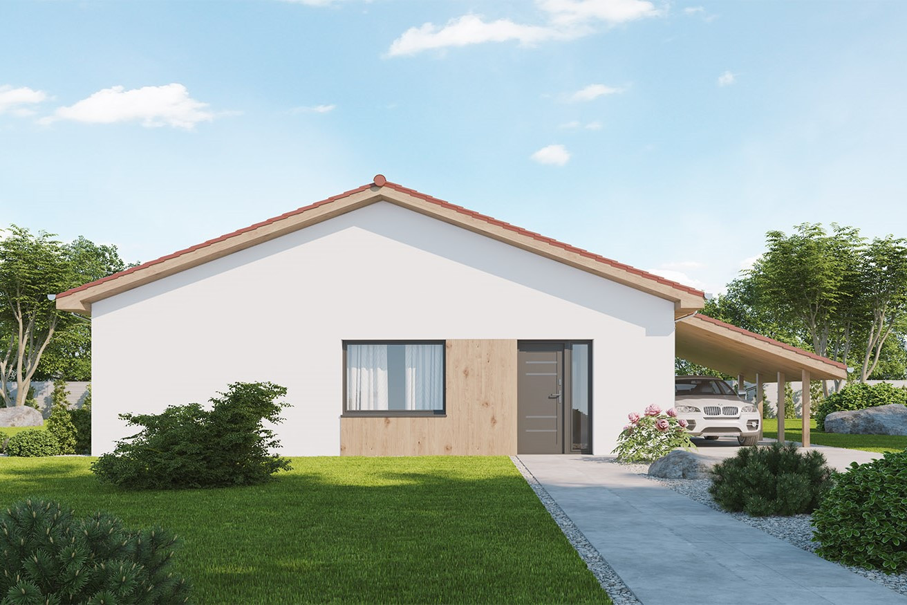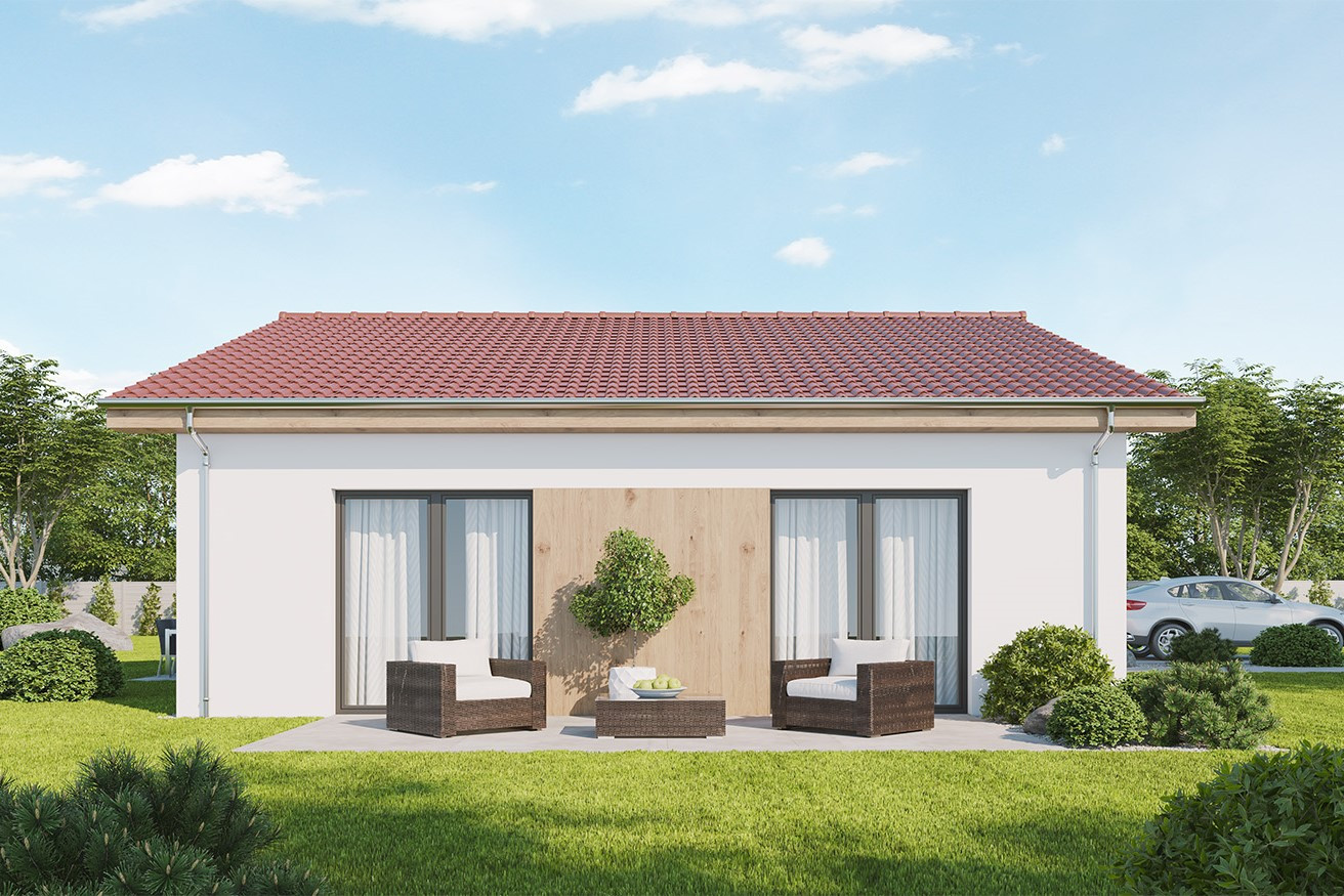 Přízemní bungalov se sedlovou střechou nabízí jednoduchou architekturu a pohodlné bezbariérové bydlení pro čtyřčlennou rodinu. Úsporná d... ispozice je rozdělena na společnou denní a soukromou ložnicovou část se třemi pokoji. Pod přesahem střechy je kryté garážové stání pro 1 automobil. jedná se o ekonomické řešení s výhodným poměrem cena-výkon.