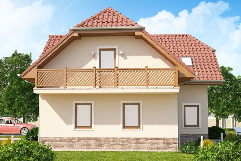Dům má jednoduchou funkční architekturu, bude se dobře hodit jak na venkov, tak do menšího města. Pří malé zastavěné ploše nabízí pohod... lné bydlení pro 5 – 6 osob. Zaujal nás společný obývací prostor v přízemí. Kuchyňská část s jídelnou má samostatný vstup a posuvné dveře do obývacího pokoje – lze je vzájemně propojit, ale i oddělit. V přízemí je i ložnice a malá koupelna, takže sem lze ubytovat návštěvu nebo starší rodiče. Podkroví ukrývá překvapivě velkou hlavní ložnici s vlastní šatnou a balkonem.