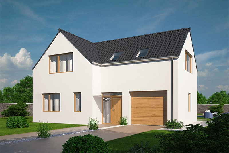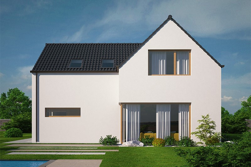 Dům postavený ve volné krajině elegantně spojuje tradiční tvar venkovského stavení s moderním designem. Má společnou obývací část v přízemí a ložnice v podkroví. Díky zvýšené nadezdívce je i pod šikmými stropy dost místa a velká okna dávají hodně světla. Odolná konstrukce z tvárnic