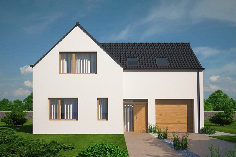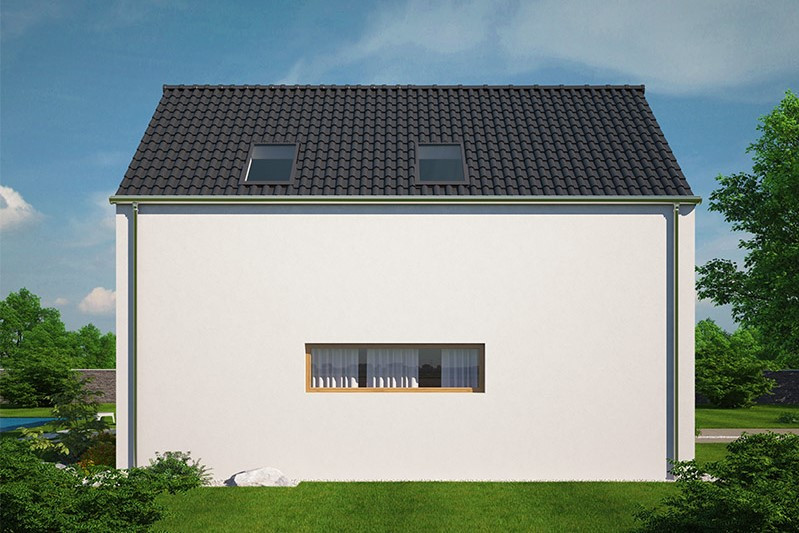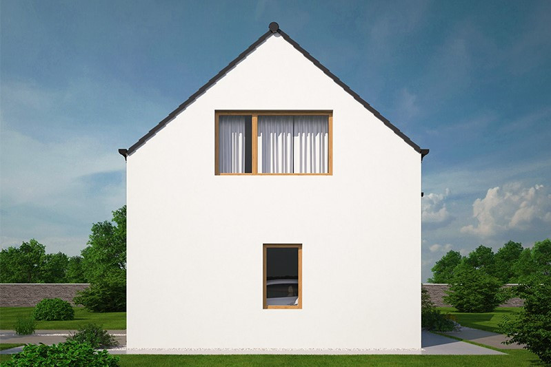 Dům má nadčasový moderní vzhled, vhodný jak na venkov, tak do městské čtvrti. Pří malé zastavěné ploše nabízí pohodlné bydlení pro a... ž 5 osob a také integrovanou garáž pro 1 automobil. V přízemí je velkorysý společný obývací prostor s okny do tří stran, podkroví ukrývá velkou hlavní ložnici s vlastní šatnou a koupelnou i pohodlné zázemí pro děti. Celkově dům nabízí úsporné, ale příjemné moderní bydlení za přijatelnou cenu. Je vhodný pro pozemky s různou orientací ke světovým stranám.