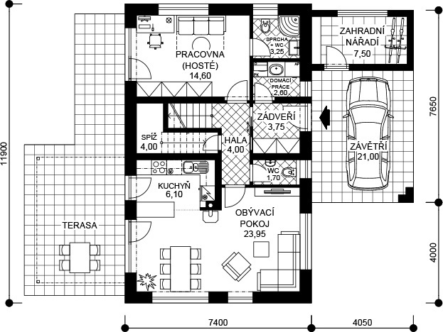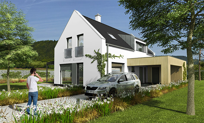 Dům tradičního vzhledu s moderním designem najde využití jak na vesnici, tak ve městě. Nabízí praktické bydlení až pětičlenné rodině. ... Promyšlená dispozice zahrnuje oblíbený obývací pokoj ve tvaru L, pracovnu, pohodlné zázemí a přistavěné kryté parkovací stání. Pracovnu lze využít pro vícegenerační bydlení.