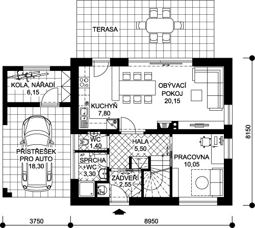 Najdete tu vše, co by v domě pro pětičlennou rodinu mělo být – v přízemí je společná obývací část propojená se zahradou, v podkroví tři dětské pokoje a ložnice rodičů. Všude dostatek úložného prostoru, výhodou je garáž propojená se zádveřím a také domácí pracovna.