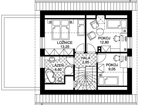 Velmi malá zastavěná plocha umožňuje výstavbu na malém pozemku, přitom v rámci účelné dispozice dům nabízí moderní komfort s nízkými náklady na provoz domácnosti. Výhodou je oddělená společná obývací část a ložnicová zóna a také dobré prosvětlení podkroví – má jak klasická fasádní, tak i střešní okna.