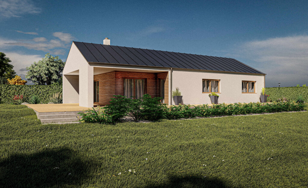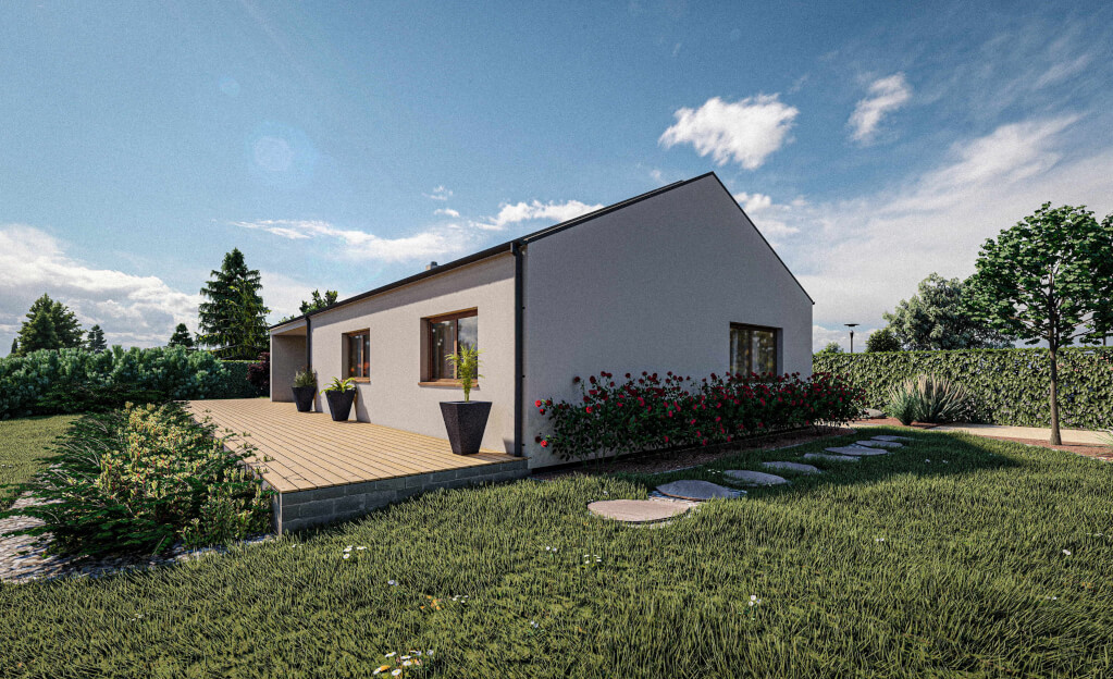 Jednoduchý bezbariérový dům poskytne praktické bydlení za výhodnou cenu a s nízkými provozními náklady. Hodí se do městské i venkovské zástavby, má příjemnou krytou terasu a francouzská okno z pokojů přímo na zahradu. Určitou daní za úspornost je malá koupelna bez vany, navíc spojená s tech. místností.
