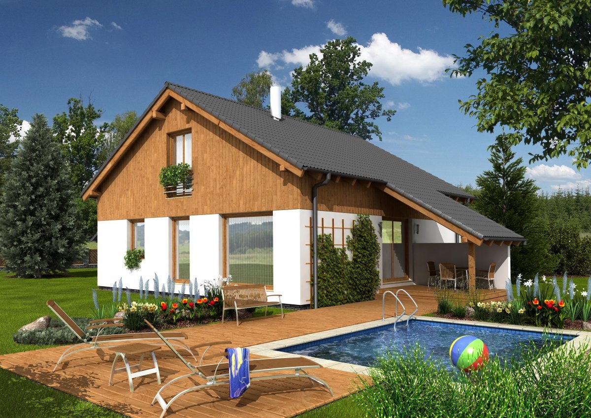 Stavba inspirovaná tradičním typem domu se sedlovou střechou se bude nejlépe hodit na venkov nebo do malého města. Je určena pro čtyř až pětičlennou rodinu a vybavena odpovídajícím zázemím. Nejhezčí částí domu je atypicky členěný společný obývací prostor, v podkroví jsou nadstandardně velké dětské pokoje. Výhodou je i přistavěná garáž s využitelnou půdou.