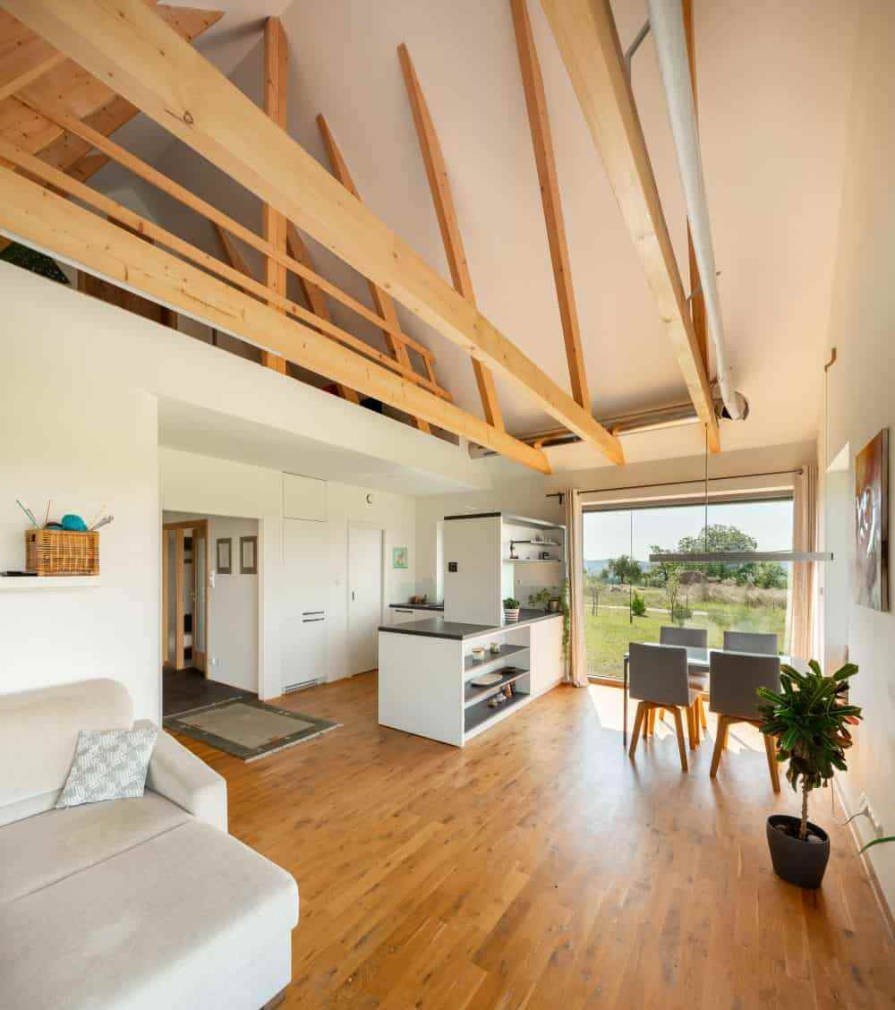 V hlavní obytné místnosti najdeme obývací prostor s kuchyňským koutem a jídelnou. Tento prostor působí velkým a světlým dojmem hlavně díky otevření půdního prostoru do krovu. Atmosféru a teplo domova dotváří i samostatně stojící krb.