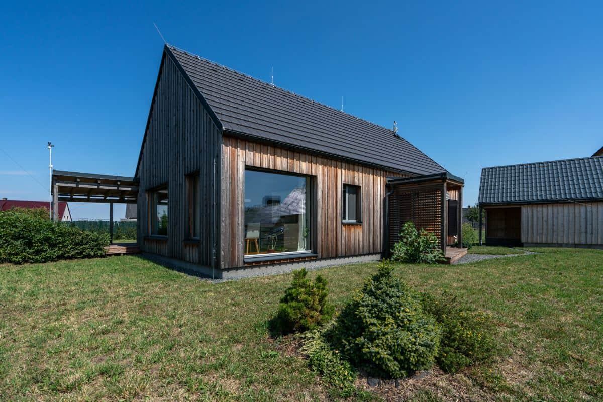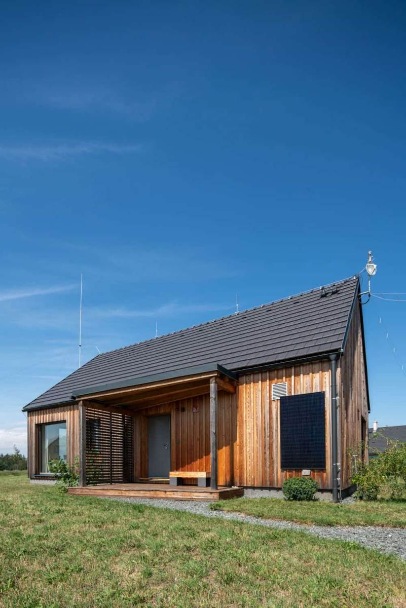 Pasivní dřevostavba se sedlovou střechou a galerií byla navržena jako moderní úsporné bydlení pro dva. Dominantu představuje společný obývací prostor otevřený do krovu. S výstupem na krytou terasu, je tu pracovna, ložnice, koupelna a technická místnost. Galerie pod krovem je určena pro návštěvy.