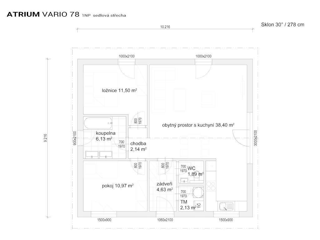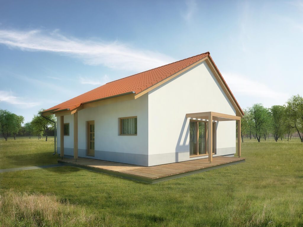Hledáte malý dům? Nebo potřebujete bezbariérový dům? Vario 78 je ten pravý! Prostorný obývací pokoj a malá kuchyně má dostačující velikost právě pro nenáročné majitele. Vše máte při ruce. V domě je také malý pokoj, který využijete pro svého potomka či návštěvu nebo jako pracovnu. To už je na vás. Pokud si k domu Vario 78 zvolíte i s dřevěnou pergolu s terasou, získáte útulné posezení s výhledem do zahrady.