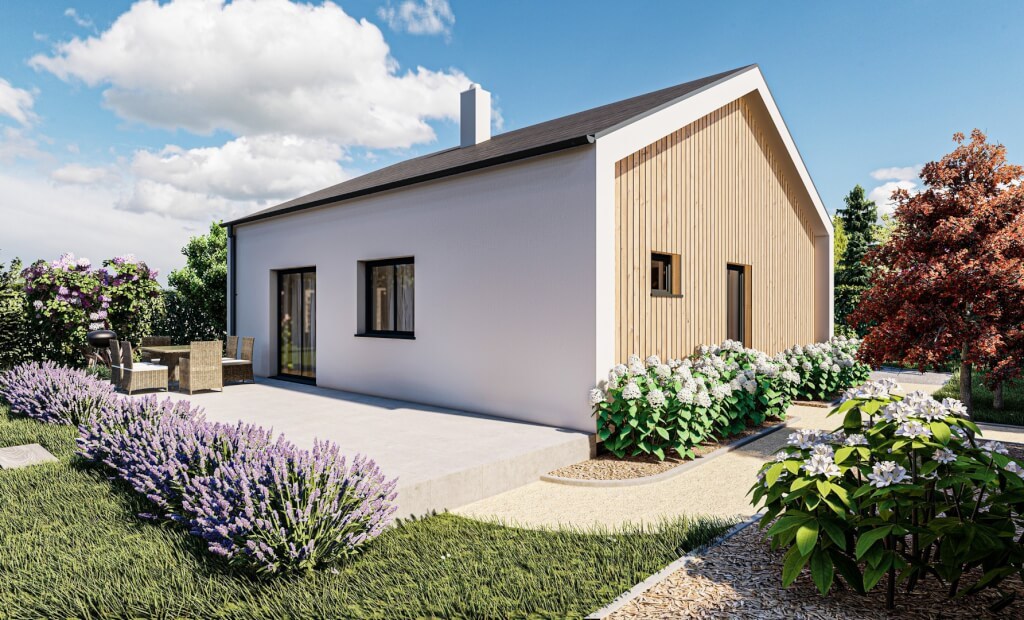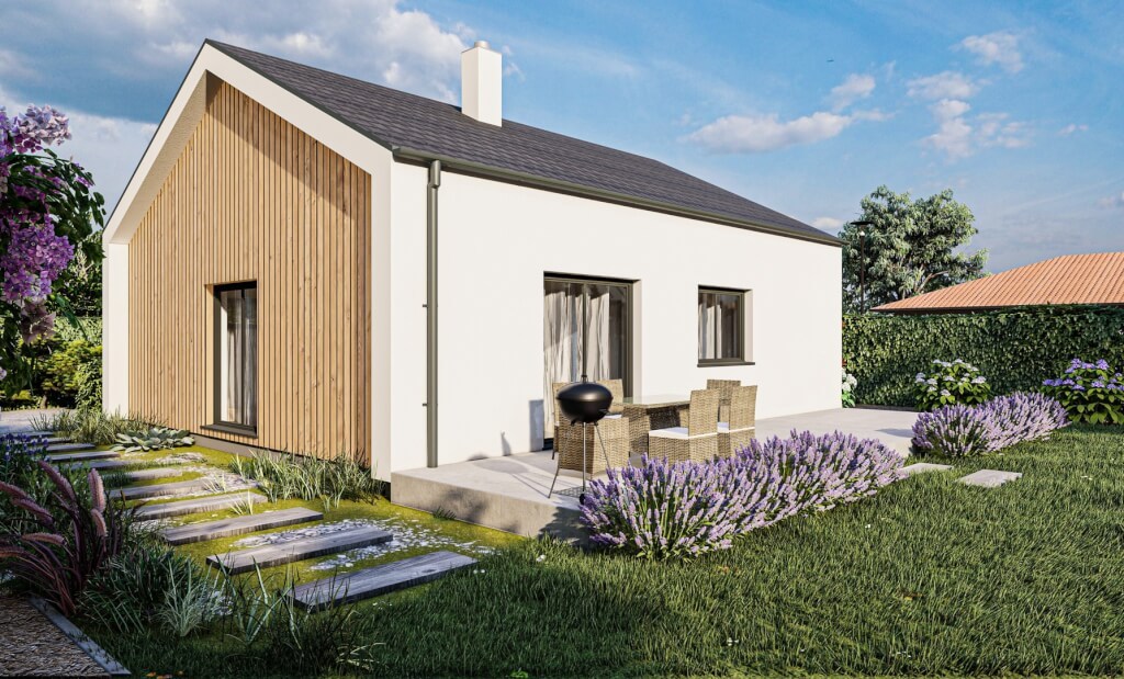 Útulné malé dřevostavby, jako je malý bungalov Vario Profi 73, jsou ideální jako víkendové bydlení nebo pro starší manželský pár, ke kterým přijedou děti na návštěvu či na prázdniny. Dům je nenáročný na úklid a údržbu. Na terasu projdete velkými francouzskými okny a užijete si krásný výhled do zahrady.