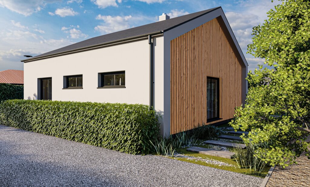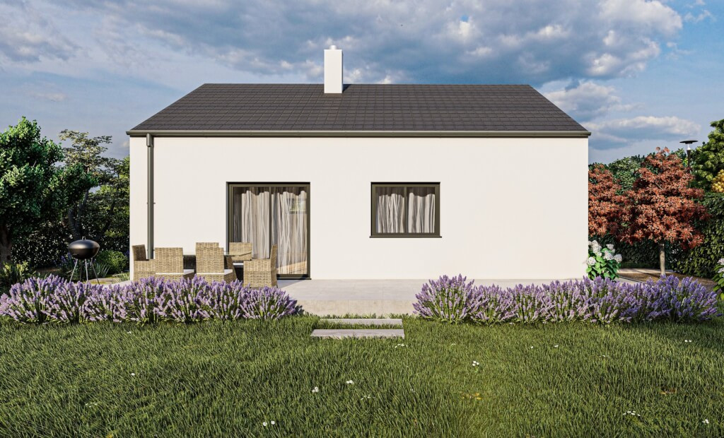 Jednoduchý moderní dům bude dobře vypadat v nové i starší zástavbě. Vyžaduje delší obdélníkový nebo velký čtvercový pozemek. Poskytne pohodlné bezbariérové rodinné bydlení, má velký společný obývací prostor, průchozí do ložnicové části. Z každého pokoje se dá vyjít přímo na zahradu. Výhodou je i úsporný provoz.