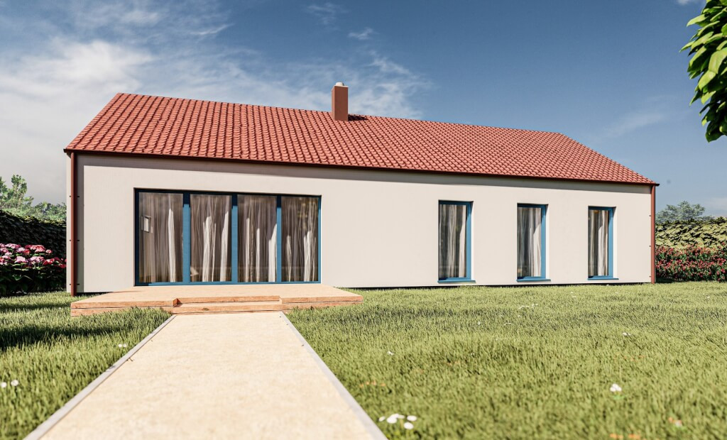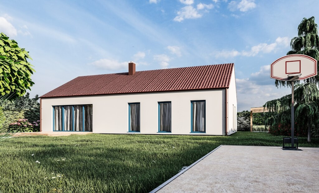 Jednoduchý moderní dům bude dobře vypadat v nové i starší zástavbě. Vyžaduje delší obdélníkový nebo velký čtvercový pozemek. Poskytne... pohodlné bezbariérové rodinné bydlení, má velký společný obývací prostor, průchozí do ložnicové části. Z každého pokoje se dá vyjít přímo na zahradu. Výhodou je i úsporný provoz.