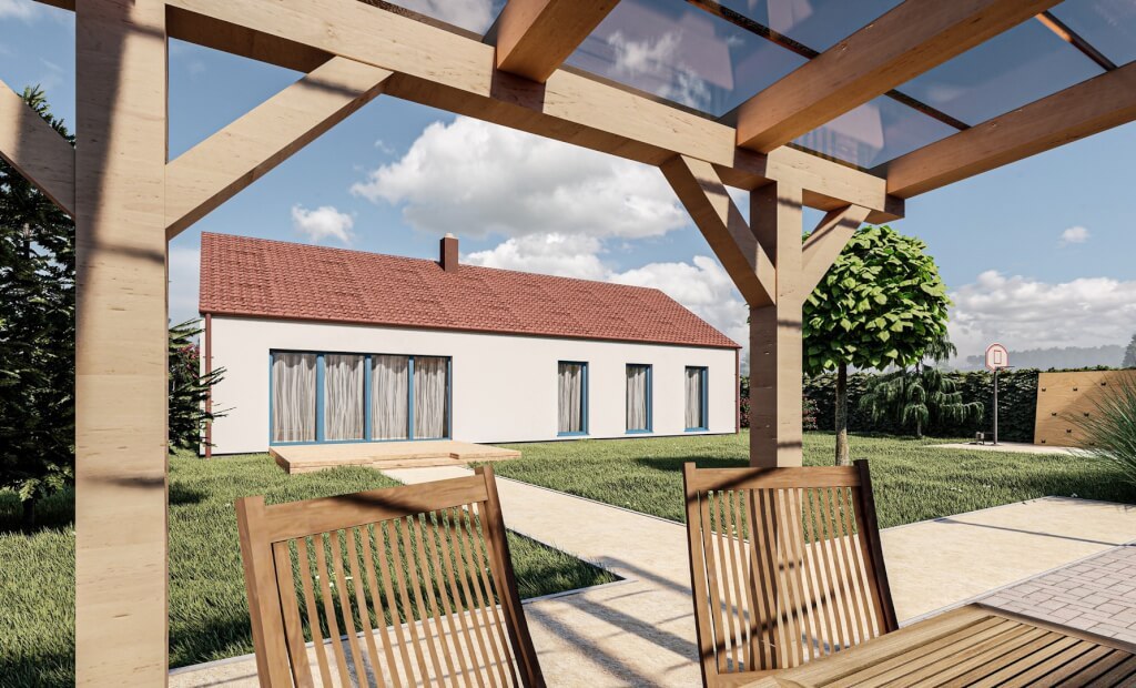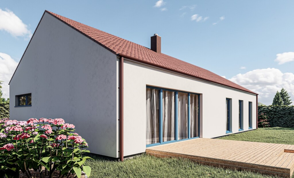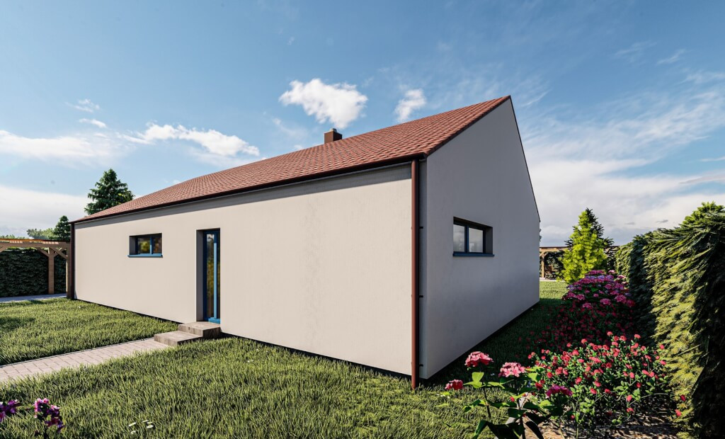 Jednoduchý bezbariérový dům poskytne praktické bydlení za výhodnou cenu a s nízkými provozními náklady. Hodí se do městské i venkovské zástavby, má příjemnou krytou terasu a francouzská okno z pokojů přímo na zahradu. Určitou daní za úspornost je malá koupelna bez vany, navíc spojená s tech. místností.