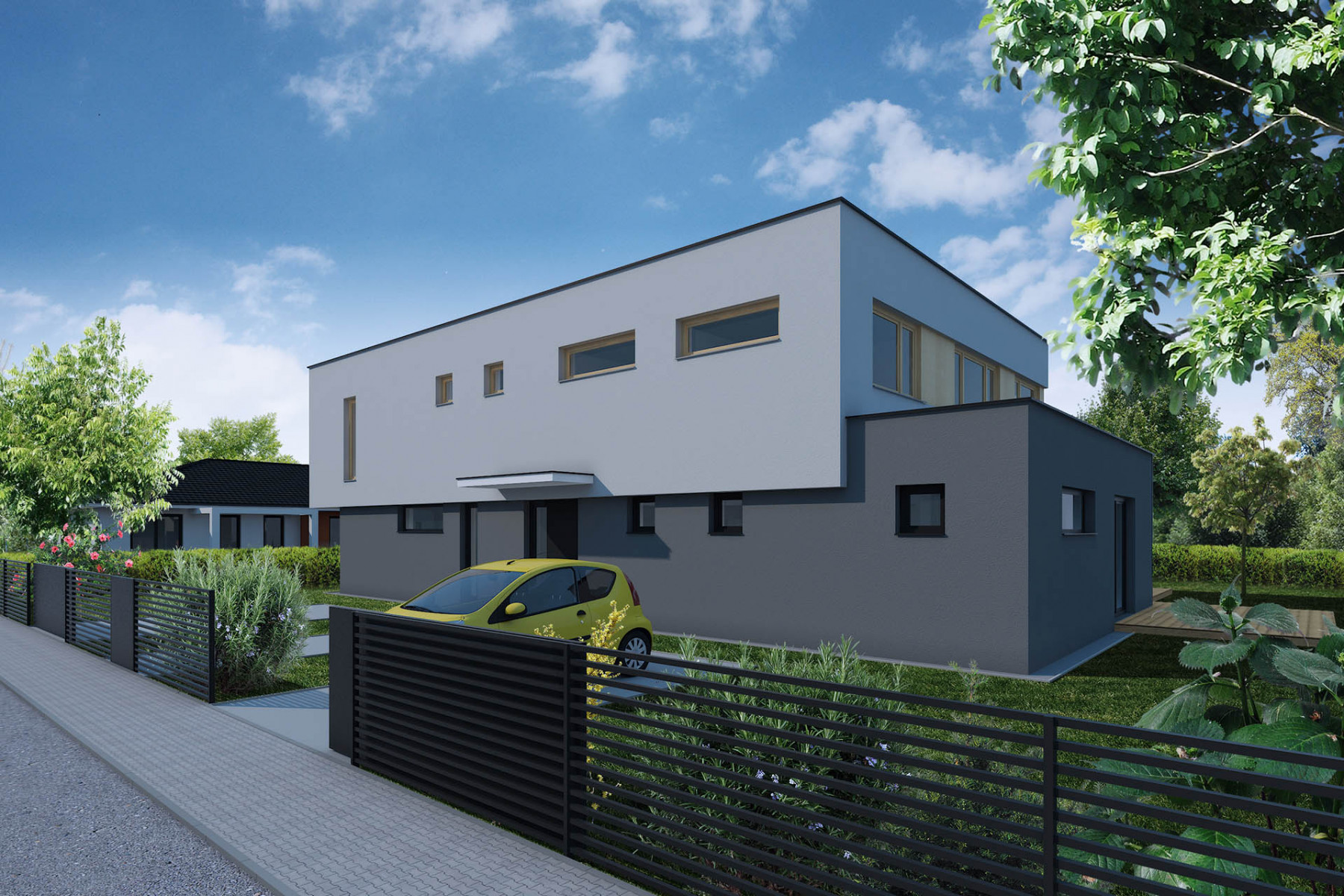 Moderní architektura s plochou střechou je určena do nové zástavby. Jedná se o jeden mála z projektů se dvěma samostatnými, provozně n... ezávislými bytovými jednotkami. Je vhodný pro soužití dvou rodin s dětmi. Každý byt má vstup v přízemí a pohodlnou dispozici ve dvou podlažích, s prostorným obývacím pokojem, vlastní terasou a komfortním zázemím. Orientace obytných místností je řešena tak, aby se rodiny navzájem nerušily. Dvojdům ušetří náklady na pozemek, realizaci stavby i provoz domácnosti.