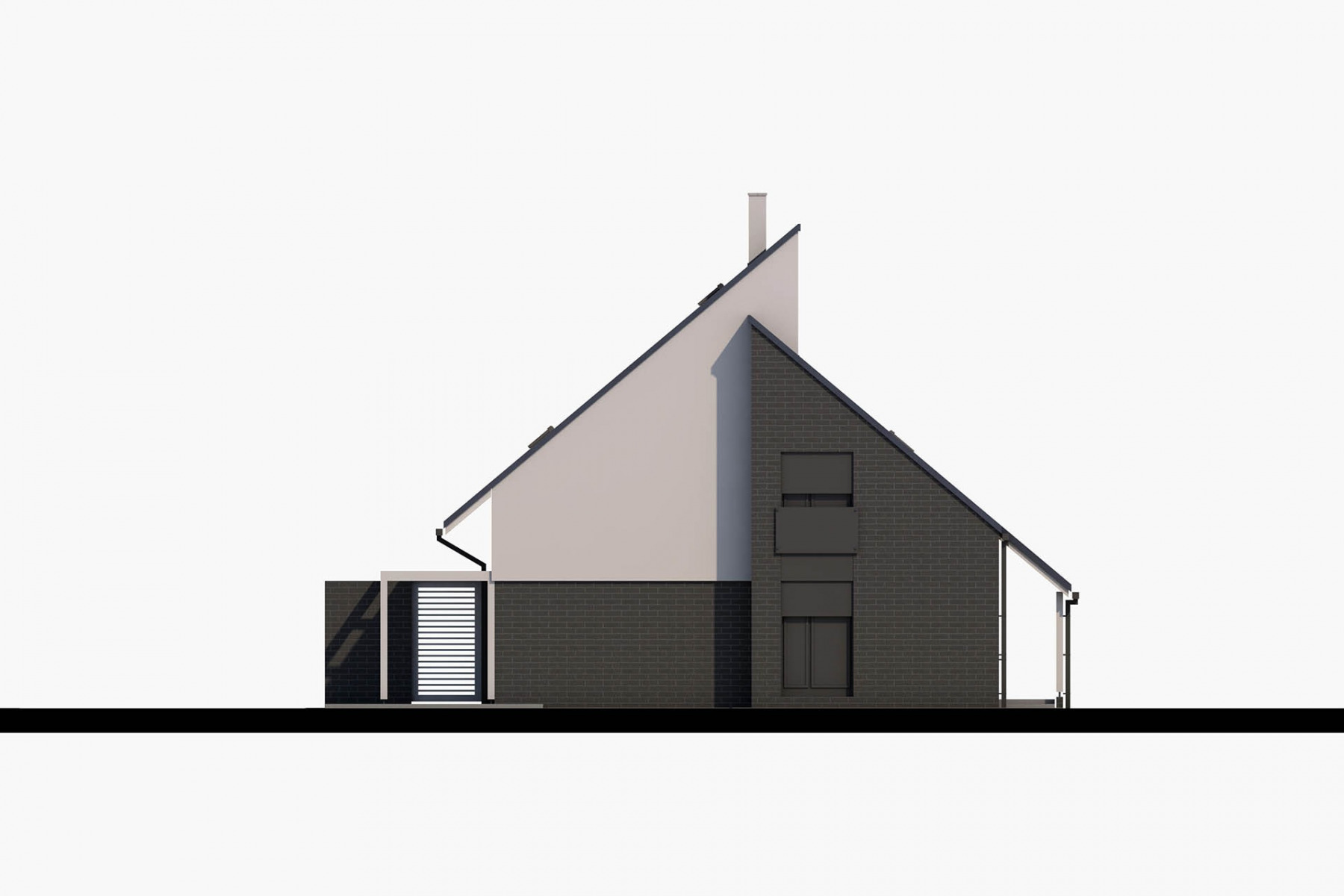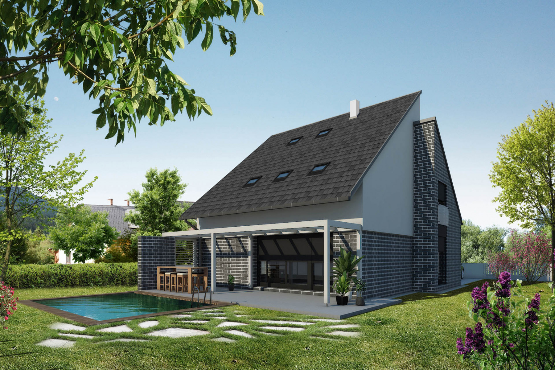 Dům dobře zapadne do města i na venkov a uspokojí nároky na moderní bydlení pro čtyřčlennou rodinu. Velký společný obývací prostor v přízemí je promyšleně rozdělen na kuchyňskou část a sezení, ke kladům patří také chráněná rohová terasa, pohodlné zázemí a dostatek úložného prostoru.