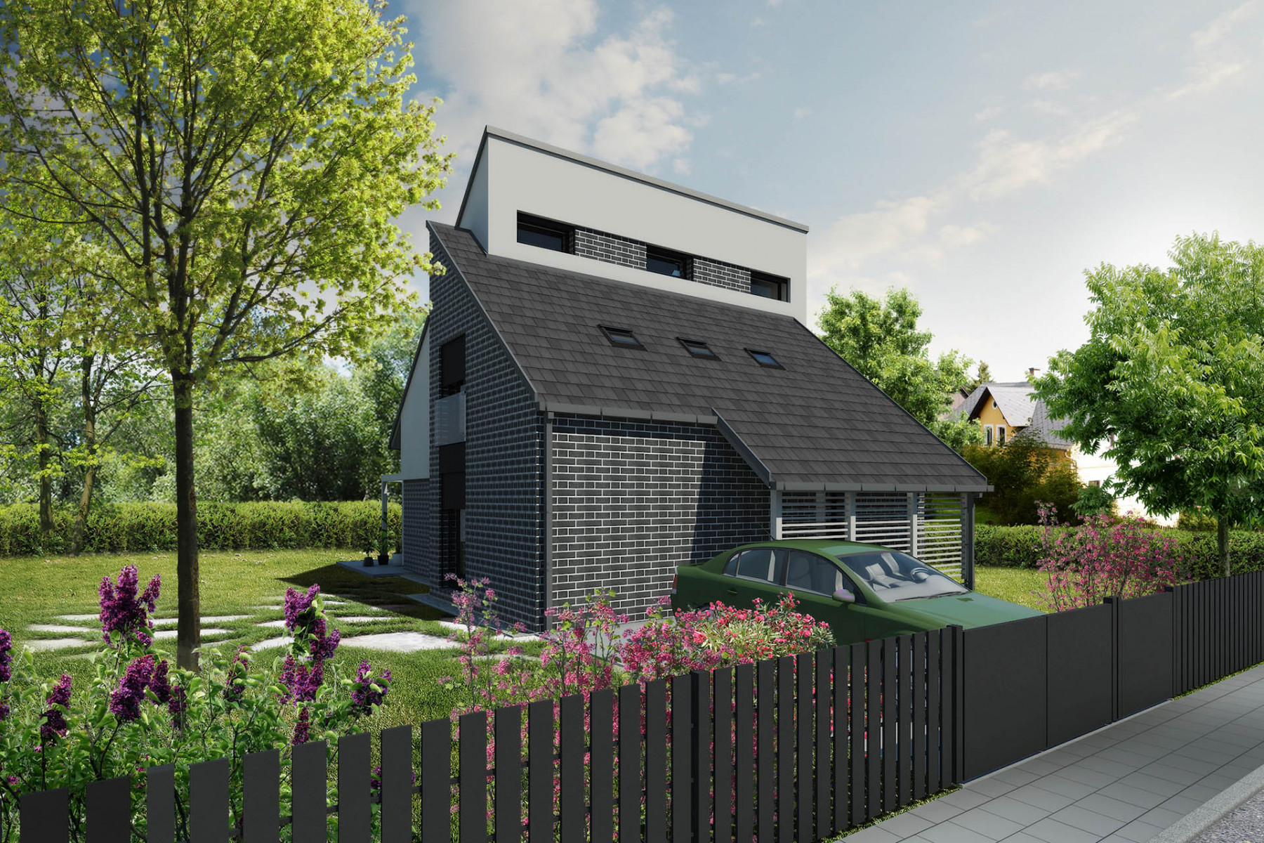 Dům pro čtyřčlennou rodinu je řešen s ohledem na pohodlí a soukromí. Prosvětlený společný obývací prostor je plně orientován do klidové části zahrady. V ložnicovém podlaží se děti a rodiče navzájem neruší, k dispozici jsou dvě velké koupelny a z každého pokoje je výstup na terasu. Výrazná moderní architektura vynikne především v nové zástavbě.