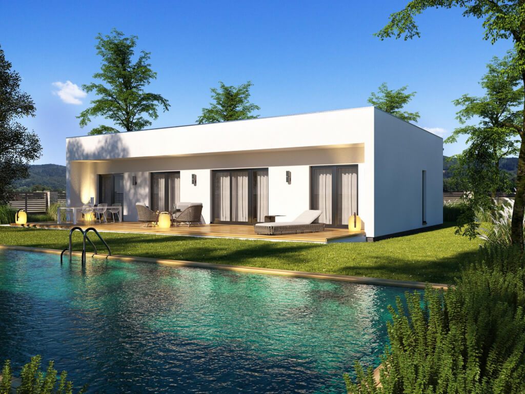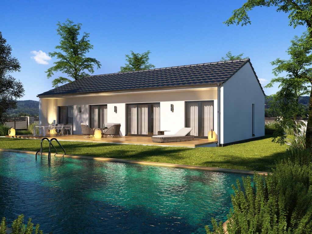 Jednoduchý bungalov s pohodlnou dispozici si můžete vybrat s plochou, nebo sedlovou střechou, takže se hodí do jakéhokoliv prostředí. Dispozic... e je bezbariérová, všechny pokoje mají výstup na terasu, dům má komfortní zázemí, a zároveň úsporný provoz. Pro rodiče je určena komfortní ložnice s šatnou, 2 děti mají vlastní koupelnu