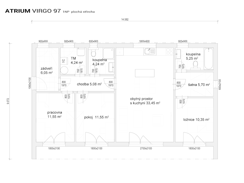 Moderní vzhled přízemního domu Virgo 97 jistě zaujme svou jednoduchostí. Rovné linie navíc podtrhují jeho nadčasovost. Velká prosklená francouzská okna vás zvou k příjemnému posezení u kávy či sklenky vína na venkovní terase. Dům si oblíbí starší manželé nebo mladá rodina.