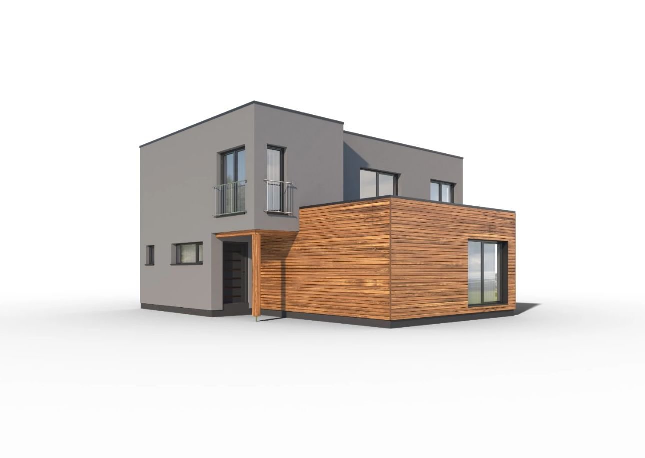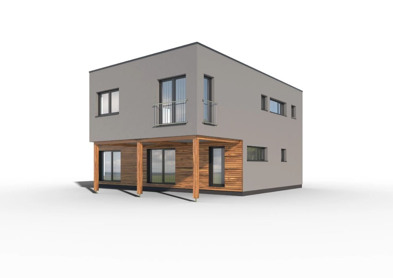 Elegantní moderní dům je určen pro bydlení městského typu a nabízí pohodlné bydlení pro čtyřčlennou rodinu s odpovídajícím zázemím v... četně kryté terasy a dostatečného úložného prostoru. Jeho těžištěm je velká obytná schodišťová hala s galerií. Na rozdíl od běžného standardu je zde velká kuchyň a obývací pokoj oddělen od kuchyně s jídelnou.