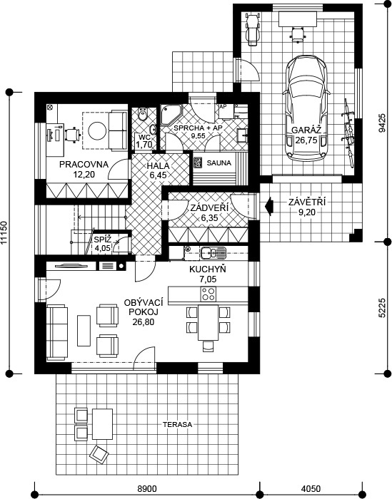 Na chráněné závětří navazuje hala s otevřeným schodištěm do podkroví. Většinu přízemí zaujímá společný obývací pokoj s praktickou dispozicí ve tvaru písmene L a výstupem na terasu. Je tu i pracovna, koupelna a technická místnost průchozí do garáže. V podkroví se nacházejí dva dětské pokoje, ložnice se šatnou, lázeň a WC. Dům je určen pro rovinatý nebo mírně svažitý pozemek, s orientací hřebene střechy kolmo na přístupovou komunikaci.