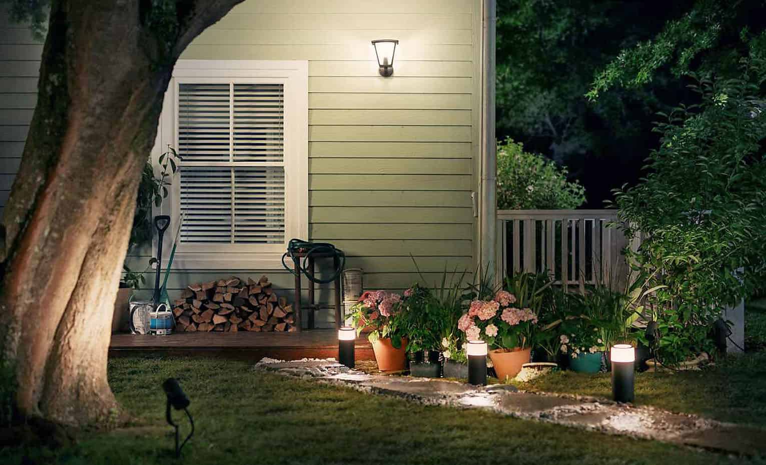 Díky pohybovému senzoru Philips Hue Outdoor se světla na stěně při vašem pohybu po zahradě vždy automaticky rozsvítí (PHILIPS)