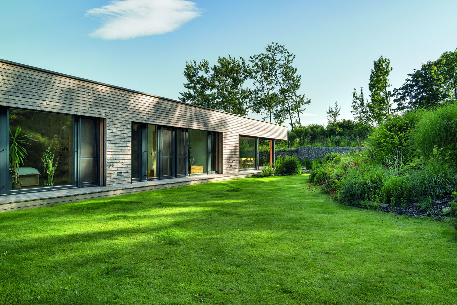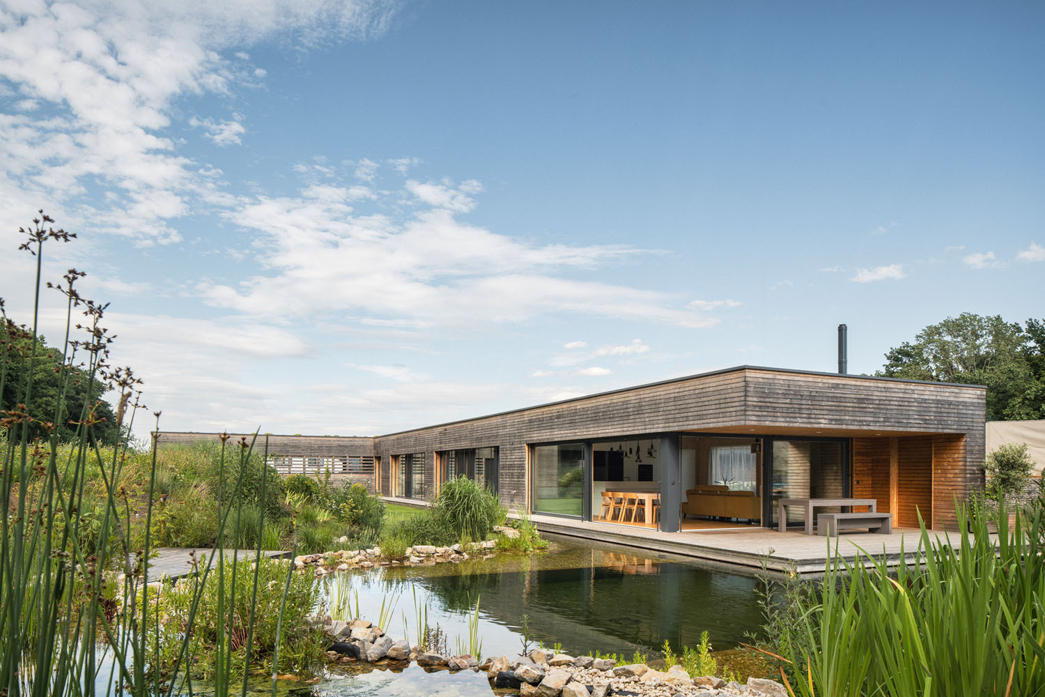 Rodinný dům vyrostl z myšlenky propojit bydlení s přírodou – proto je přízemní, dřevěný, respektuje sklon terénu a zapadá do zeleně. „Když jsem sem prvně přijel, viděl jsem okolo rozkvetlé louky. Museli jsme na tento výhled zapomenout a zohlednit, že se situace změní, že tady vyrostou další rodinné domy. Tím pádem jsme se v projektu vzdali pohledu do krajiny, ten podstatný jsme obrátili směrem dovnitř. Dům sám sobě vytváří určitou intimitu,“ vysvětluje příběh návrhu architekt Lukáš Pejsar ze studia 3AE, generálního dodavatele stavby od základové desky až po vnitřní vybavení.