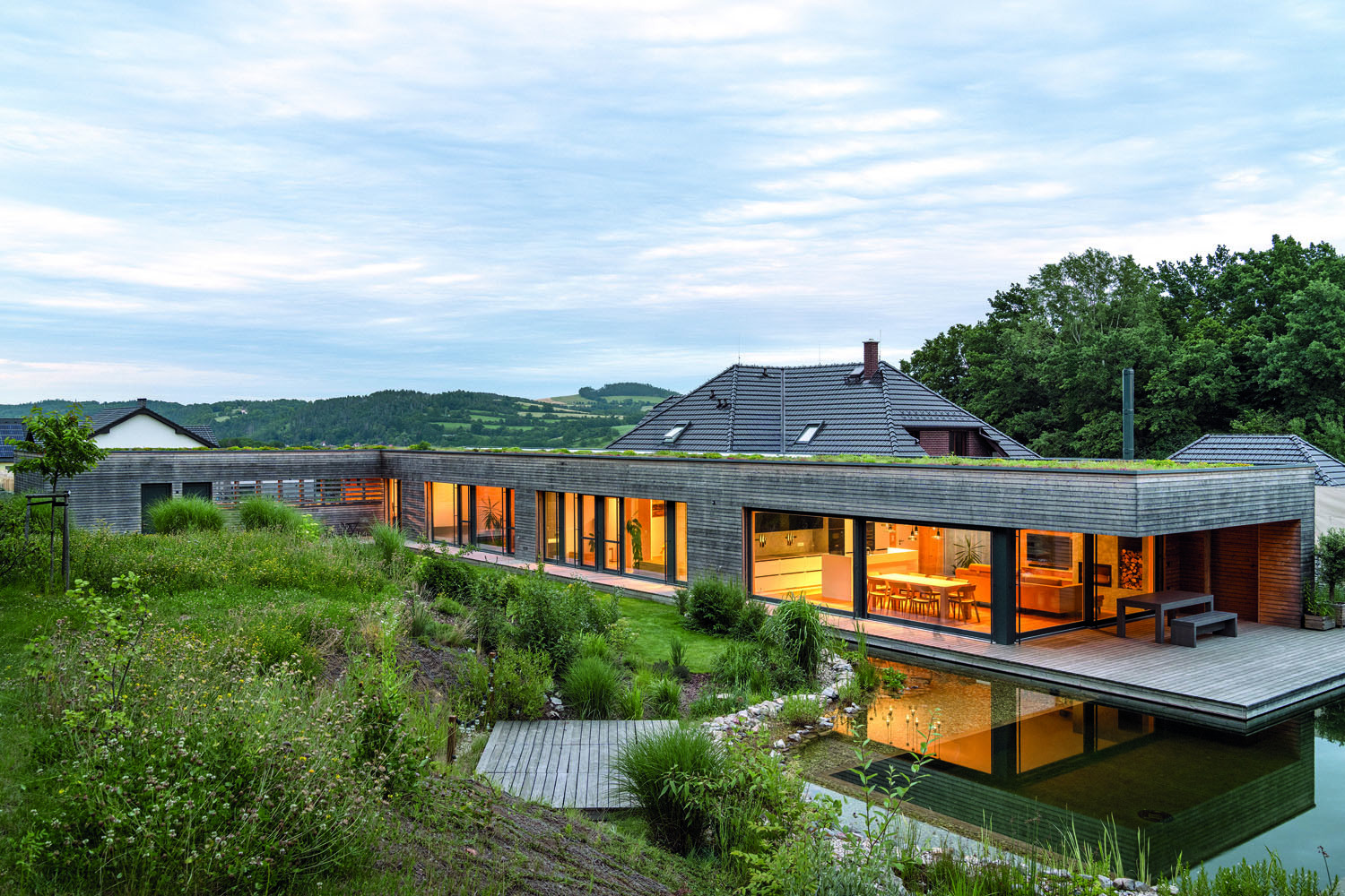 Proč architekt otočil nízkopodlažní dřevostavbu k lesu a vzdal se tím výhledu do malebné krajiny jihozápadně od Prahy? Předem už věděl, že bude brzy zastavěná. Majitelům rodinného domu přesto nechybí výhled do zeleně, navíc mají ochráněné soukromí.