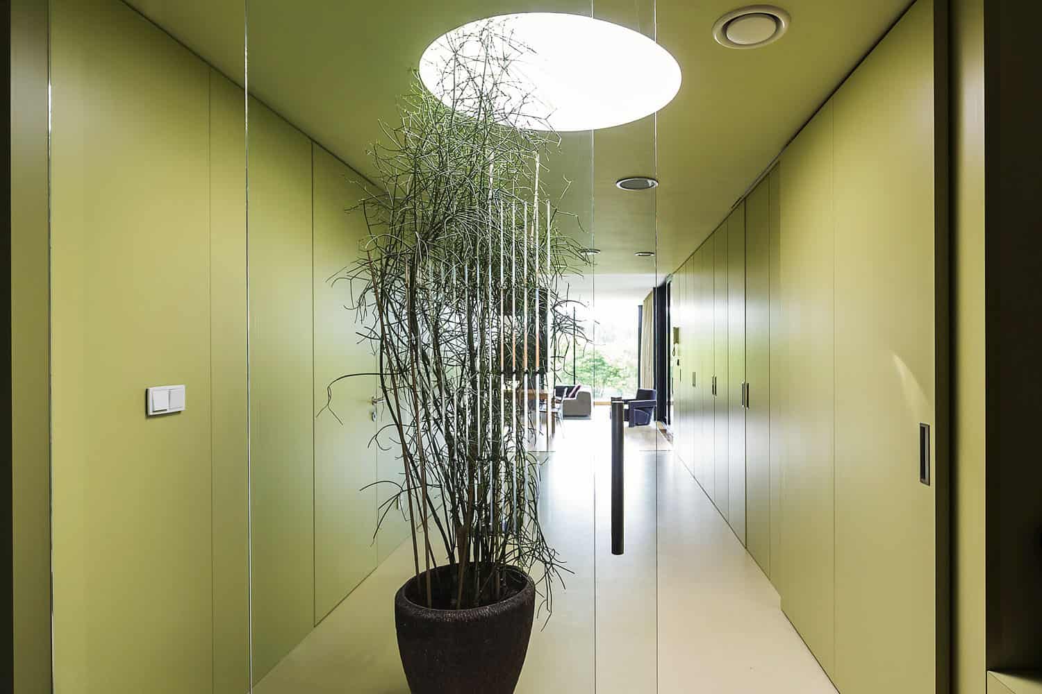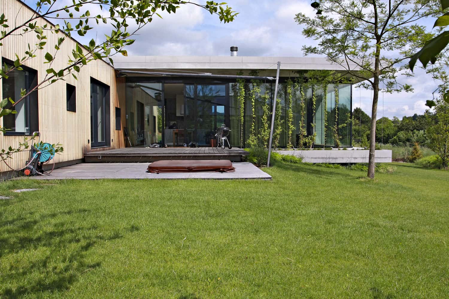 Požadavky na dům byly jasné. Majitelé nechtěli schody a patro, přáli si přízemní stavbu, ne příliš velkou, která umožní spokojené a pohodlné fungování čtyřčlenné rodiny a bude zahrnovat i prostor pro návštěvy. Vzhledem k tomu, že se pozemek mírně svažuje k jihu, měli představu domu s pěknými výhledy, otevřeného do zahrady a krajiny.
