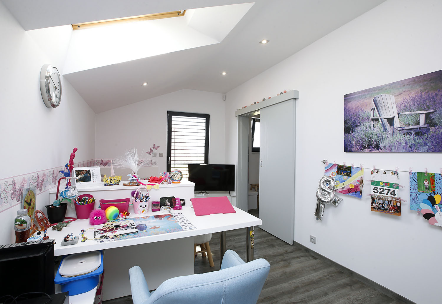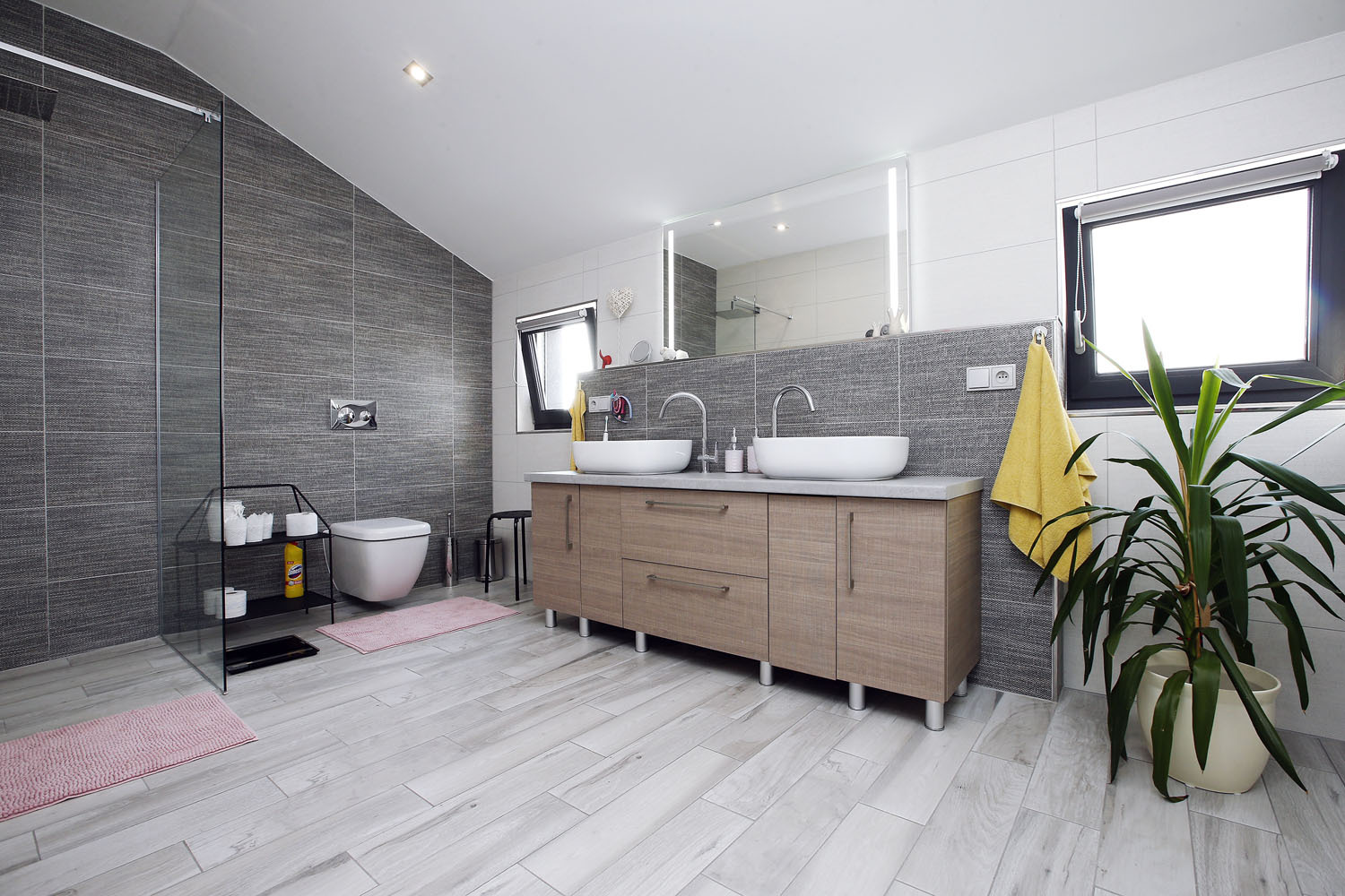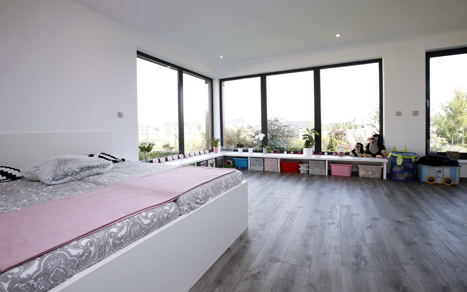 Společná obývací část se otevřeným schodištěm rozšiřuje na prosklenou galerii v podkroví. To je rozděleno na část pro děti a zónu rodičů s velkorysou šatnou, hlavní ložnicí a rodičovskou koupelnou.