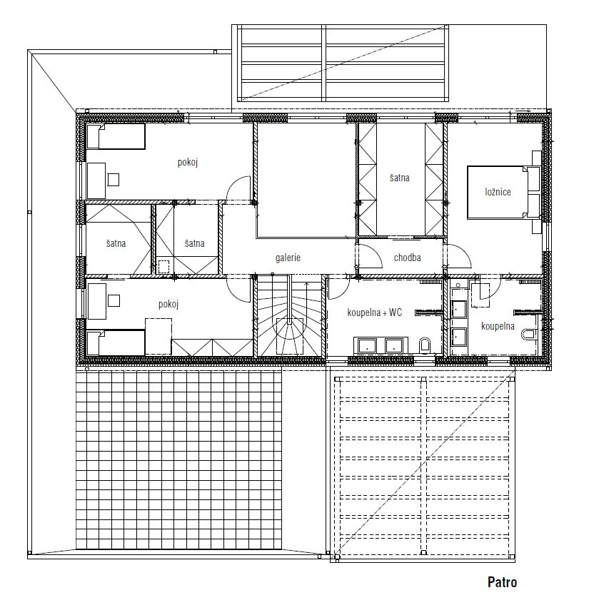 ▪ Konstrukce: betonové základové pasy se ztrac. bedněním, betonová podkladní deska, montovaná dřevostavba se sloupkovou konstrukcí two-by-four, dřevěné trámové stropy, dřevěný krov, sedlová střecha s krytinou Bramac Tegalit, plochá střecha s fóliovou krytinou, parkovací stání a pergola – dřevěná trámová konstrukce