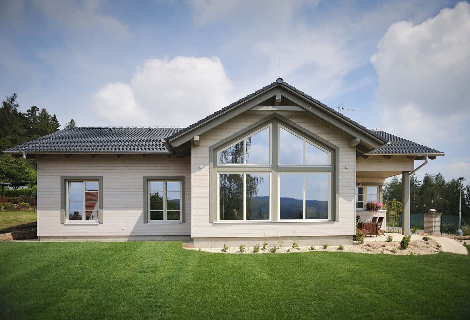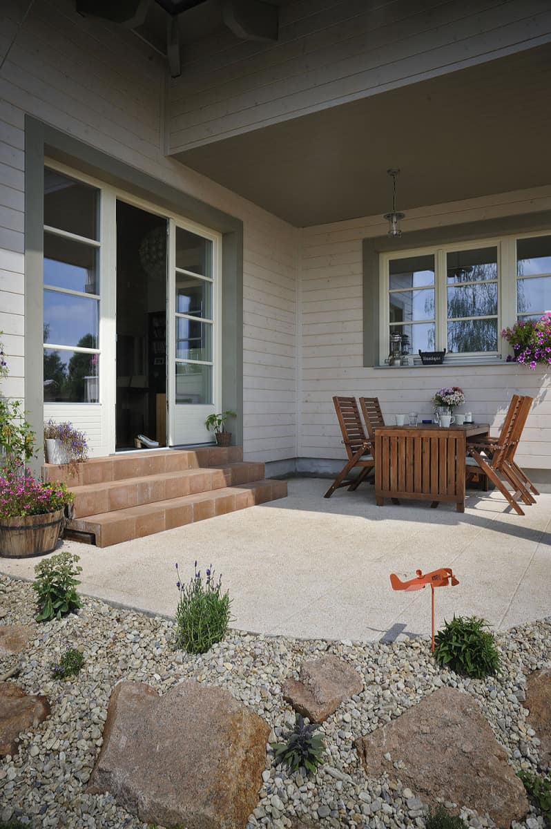 Mladí manželé s malým dítětem bydleli ve větším domě, ale nevyhovoval jim ani dispozicí, ani stylem, a proto se rozhodli vybudovat si nový domov. „Původní dům byl zbytečně velký, navíc jsme chtěli bydlet pohodlně v jednom podlaží, bez běhání po schodech,“ vysvětluje projektantka, stavitelka a majitelka dřevostavby v jedné osobě.