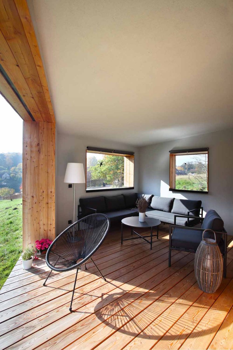 Atypický tvar originální dřevostavby na konci malé obce na Benešovsku není rozmarem architektů, kteří chtěli předvést svou invenci, ale vznikl na základě citlivého přístupu ke krásné krajině a přání stavebníků dosáhnout maximální harmonie s přírodou.