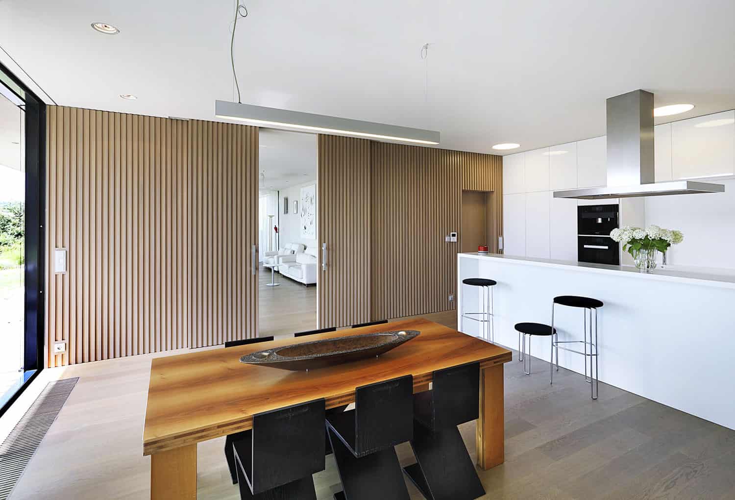 Vybrali si velký pozemek s jižní orientací a hezkým výhledem do rovinaté krajiny a oslovili architektonický ateliér T a K, který znali. „Navrhnout rodinný dům považuji za jeden z nejobtížnějších úkolů,“ říká Marek Tichý, spoluautor návrhu. „Architekt a stavebník si musí dobře rozumět a důvěřovat, je to velmi intimní záležitost. Proto pracujeme s těmi klienty, které již známe. Výhodou zahraničních klientů je to, že respektují profesionalitu a příliš nezasahují do odborné práce.“