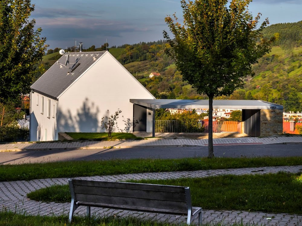 Rodinný dům ve stráni nad městečkem Brumov-Bylnice měl připomínat tradiční zděné stavení se štítem obráceným do ulice. Na jihu Valašska se totiž stavělo nejen ze dřeva, ale také z kamení nebo nepálených cihel. Měla to být jakási novodobá chalupa v sadu – zahrada zůstala svažitá a otevřená, nemá ani plot. Díky tomu jsou odtud široké výhledy na protější hřeben Bílých Karpat s typickou mozaikou lesů, horských luk a sadů, z oken je vidět hrad Brumov a město pod ním.