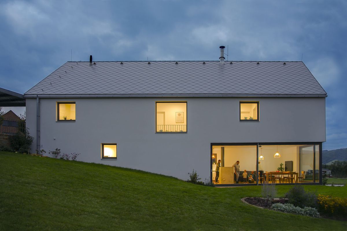 „Nad projektem jsem dlouho uvažoval, snažil jsem se co nejlépe poznat samotné místo, abych na ně dům co nejlépe posadil, využil jeho úžasný potenciál, a přitom mu neuškodil. Když jsem pak svůj návrh představil klientovi, ten pak, jako správný Valach, po krátké a bouřlivé diskusi rozhodl, že ,je to dobré‘ a že tak to bude! Hmotové řešení domu vychází z tvaru pozemku, jeho orientace a terénní konfigurace. Zároveň respektuje hlavní rysy stavění v oblasti Jižního Valašska: stavba je orientovaná štítem k ulici, má tvar úzkého protáhlého obdélníka, střecha je sedlová bez nadezdívky. Jako krytinu jsem vybral lehké vláknocementové šablony – v tomto regionu se dříve používaly šindele, později právě šablony nebo plech. Myslím, že střídmý a neokázalý dům dobře doplňují,“ dodává autor.