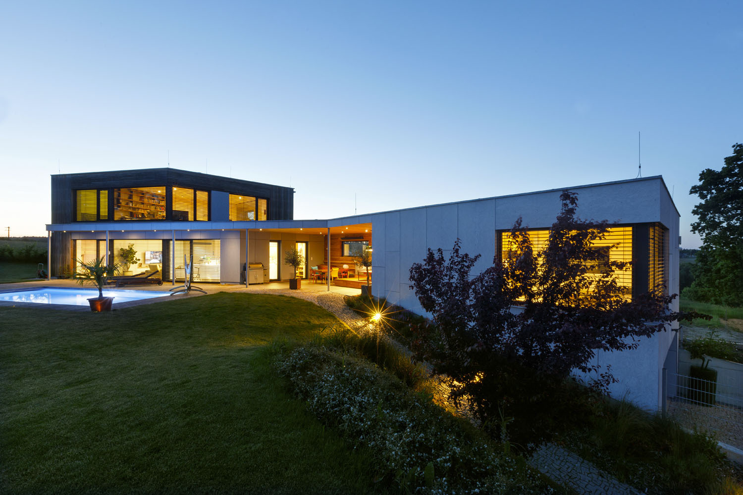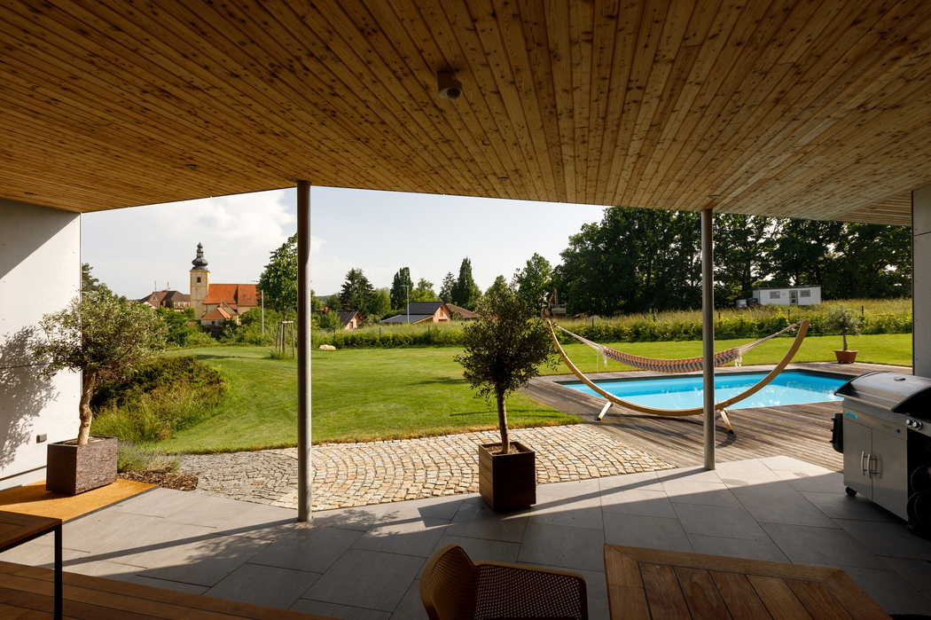 Pozemek je svažitý nejenom směrem ke komunikaci, ale také příčně. Celkový výškový rozdíl činí 4,5 m, mezi komunikací a pozemkem cca 2,5 m. „V našem návrhu jsme se zaměřili jako vždy na maximální využití pozemku. Zahrada musí být dominantní, ucelená, dokonale navazující na dům a terasy. Dům je navržen tak, aby byl maximálně opticky a funkčně propojen se zahradou. Delší strana pozemku je orientována na jihozápad. To bylo pro náš návrh zásadní. Naplnili jsme i požadavek investora, aby byl zachován výhled na jihojihovýchodně stojící faru a kostelík,“ vysvětluje architekt.