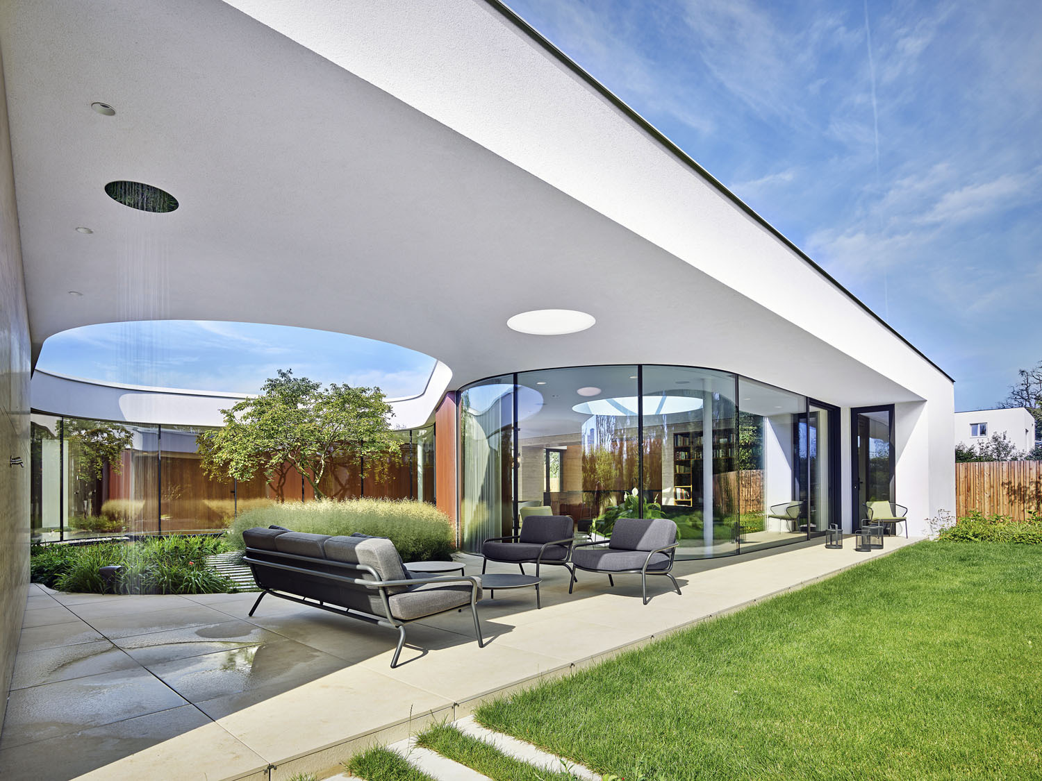 „Tvarování atria a vhodné umístění otvorů ve střeše a střešních světlíků vnáší do interiéru jihozápadní odpolední slunce, které by se do domu vzhledem k omezující orientaci pozemku nikdy nedostalo. Díky tomu mohl vzniknout prosvětlený obytný prostor s výhledem do zahrady a dále do lesa,“ komentují architekti z ateliéru Fandament Architects.
