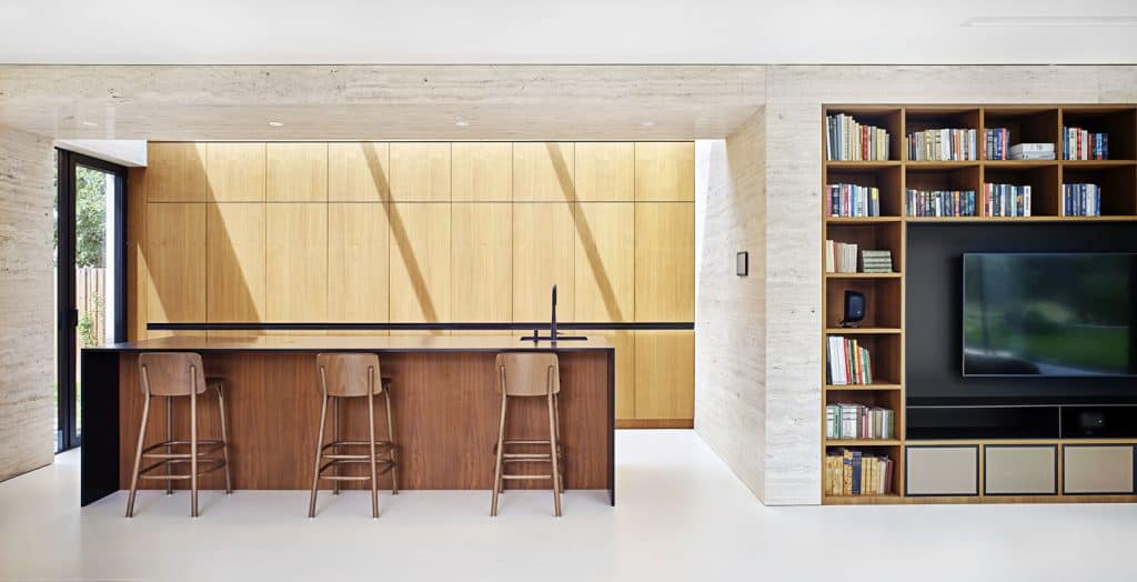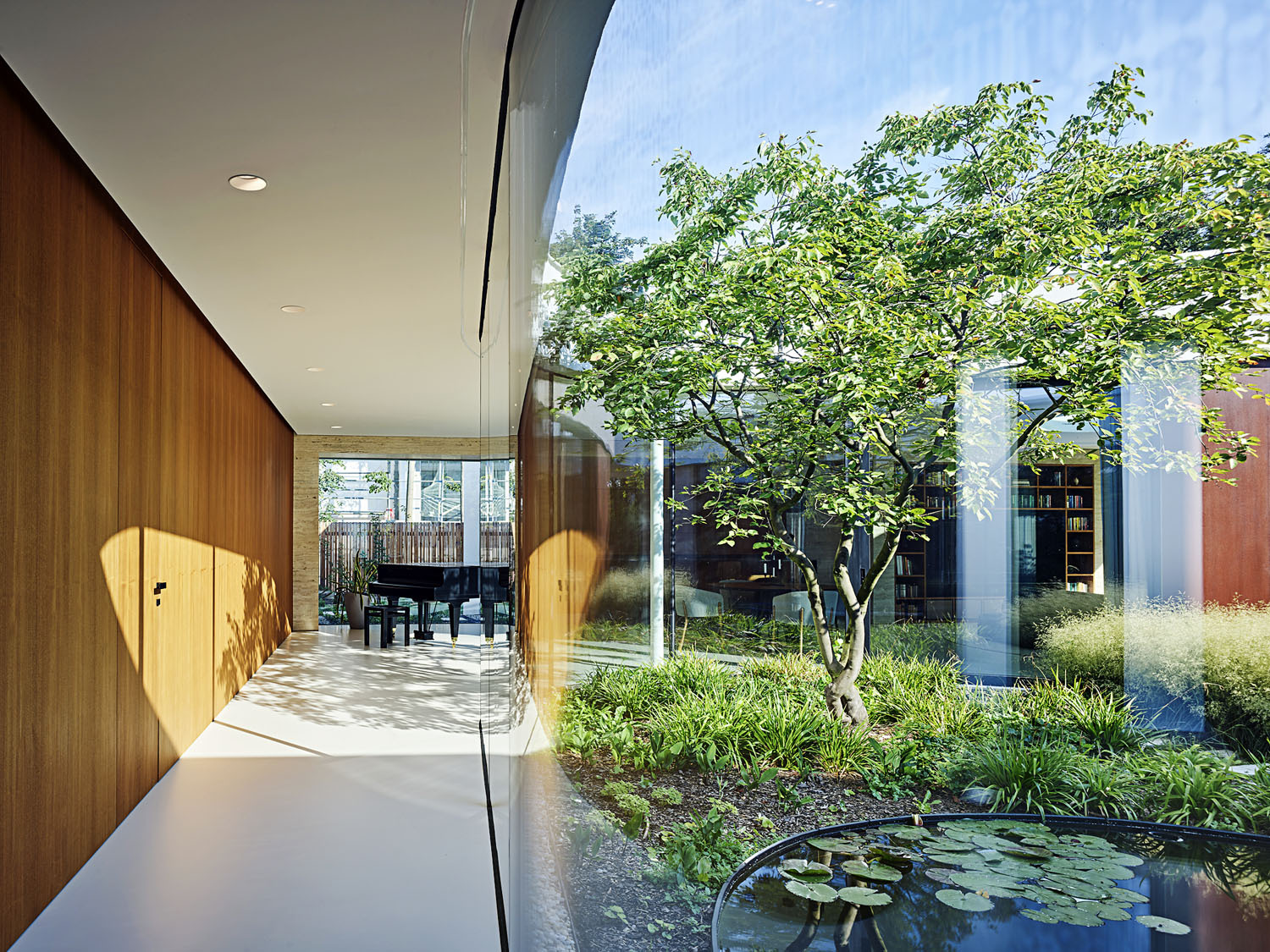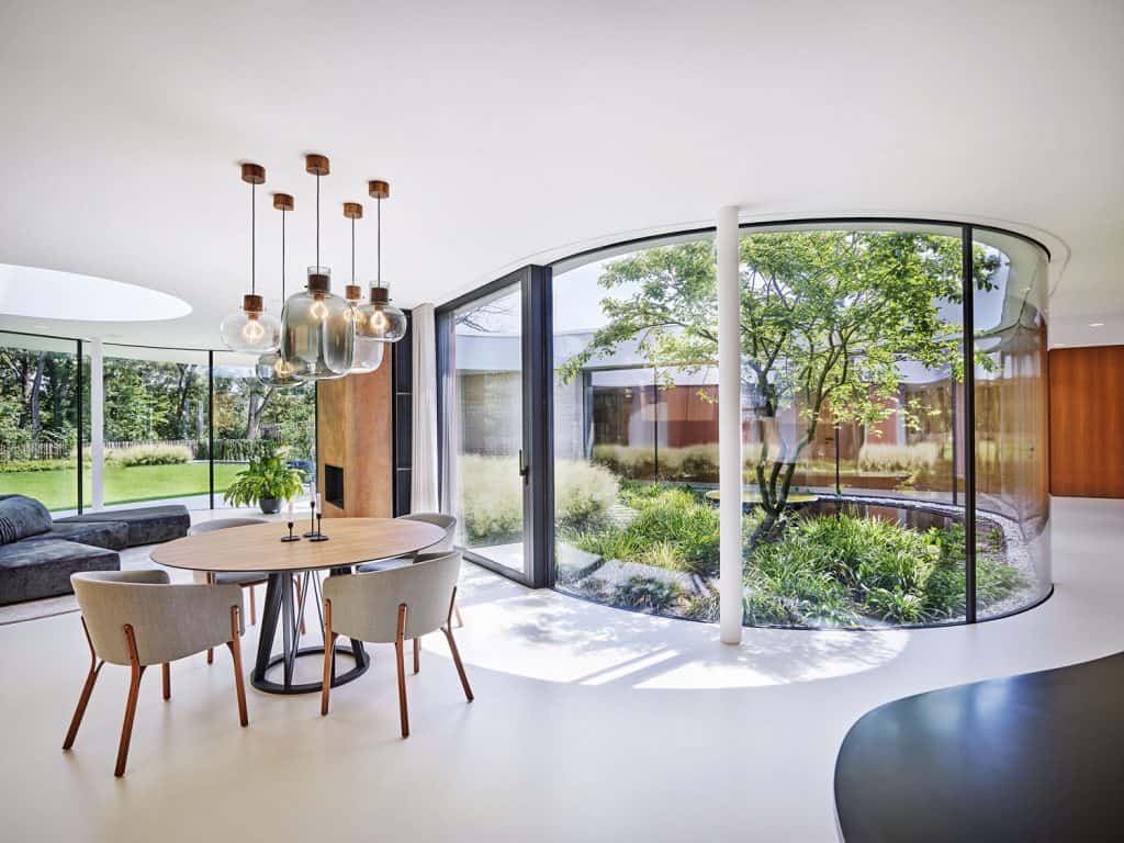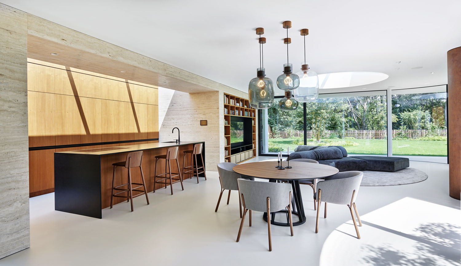 Vzájemné prolínání bydlení a přírody v tomto domě nereprezentují jen organické linie a velkorysé, bezrámově zasklené stěny – tento princip zahrnuje i celkové pojetí interiéru. Minimalistický design a výběr přírodních materiálů a barev vytvářejí harmonickou atmosféru umocněnou výhledy do zeleně. Architekti zkombinovali přírodní travertin, dřevo ve výrazném odstínu a jednolitou světlou podlahu, objevuje se i cortenový plech, soulad dokreslili doplňky a drobnými akcenty v černé a antracitové barvě. Obytný prostor je specifický nejen svým tvarem, ale i uspořádáním sedací soupravy, která je orientovaná do více stran – ke krbu a atriu, a také ke knihovně a zahradě.