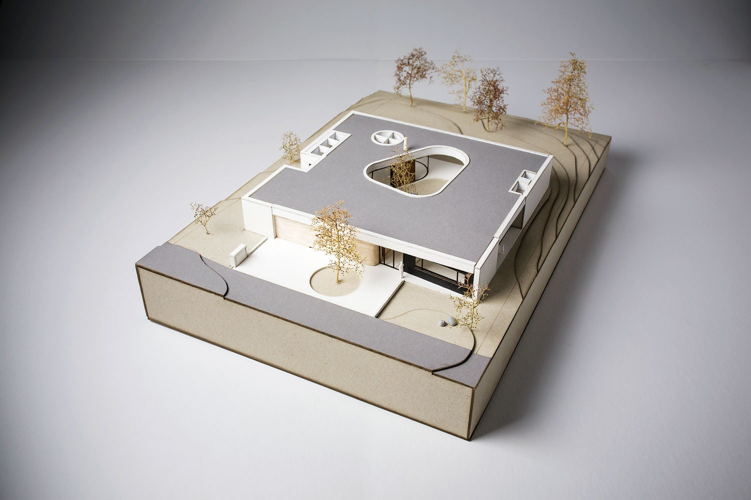 „Tvarování atria a vhodné umístění otvorů ve střeše a střešních světlíků vnáší do interiéru jihozápadní odpolední slunce, které by se do domu vzhledem k omezující orientaci pozemku nikdy nedostalo. Díky tomu mohl vzniknout prosvětlený obytný prostor s výhledem do zahrady a dále do lesa,“ komentují architekti z ateliéru Fandament Architects.