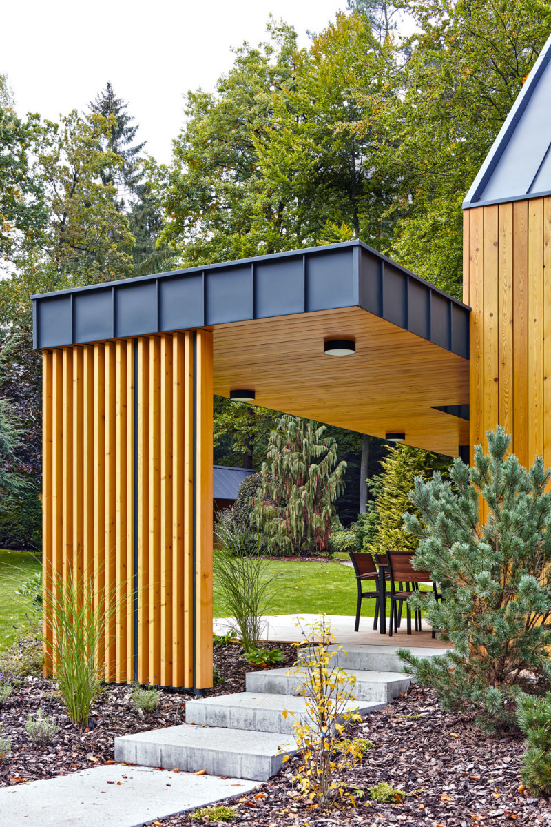 Návrh se v diskuzi s majiteli postupně vyvíjel, až nakonec architekti navrhli rozšířit původní objekt chaty se sedlovou střechou o přízemní část s ložnicí, šatnou a sociálním zázemím. Na plochou střechu přístavby propojenou s domem předsíní dále navazuje zastřešení terasy, které vytváří z čelního pohledu příjemnou optickou protiváhu – horizontální základnu kontrastující s vertikálou štítových stěn. Fasády obou částí sceluje dřevěný obklad ze sibiřského modřínu.